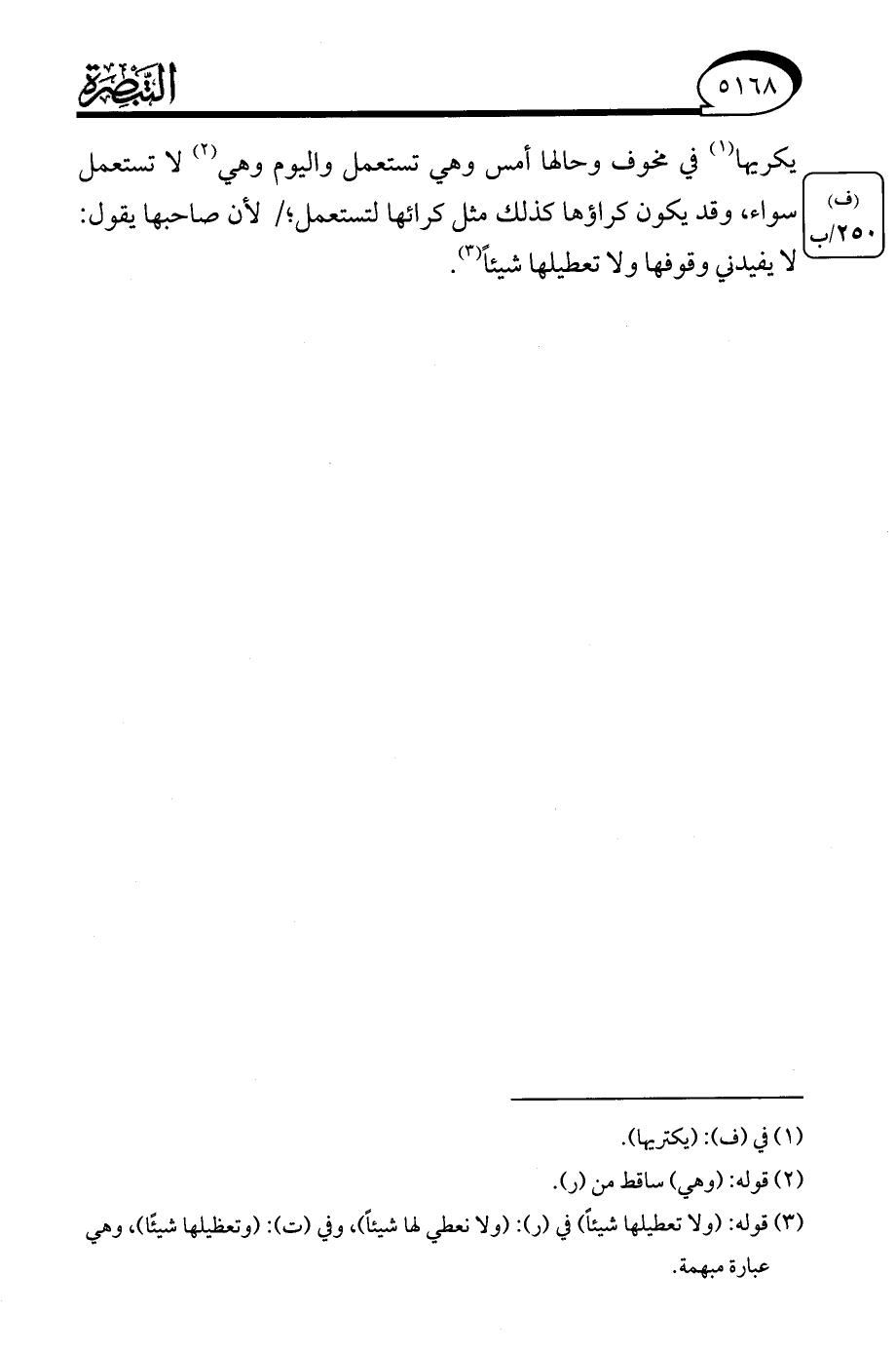 يكريها (¬1) في مخوف وحالها أمس وهي تستعمل واليوم وهي (¬2) لا تستعمل سواء، وقد يكون كراؤها كذلك مثل كرائها لتستعمل؛ لأنَّ صاحبها يقول: لا يفيدني وقوفها ولا تعطيلها شيئًا (¬3).