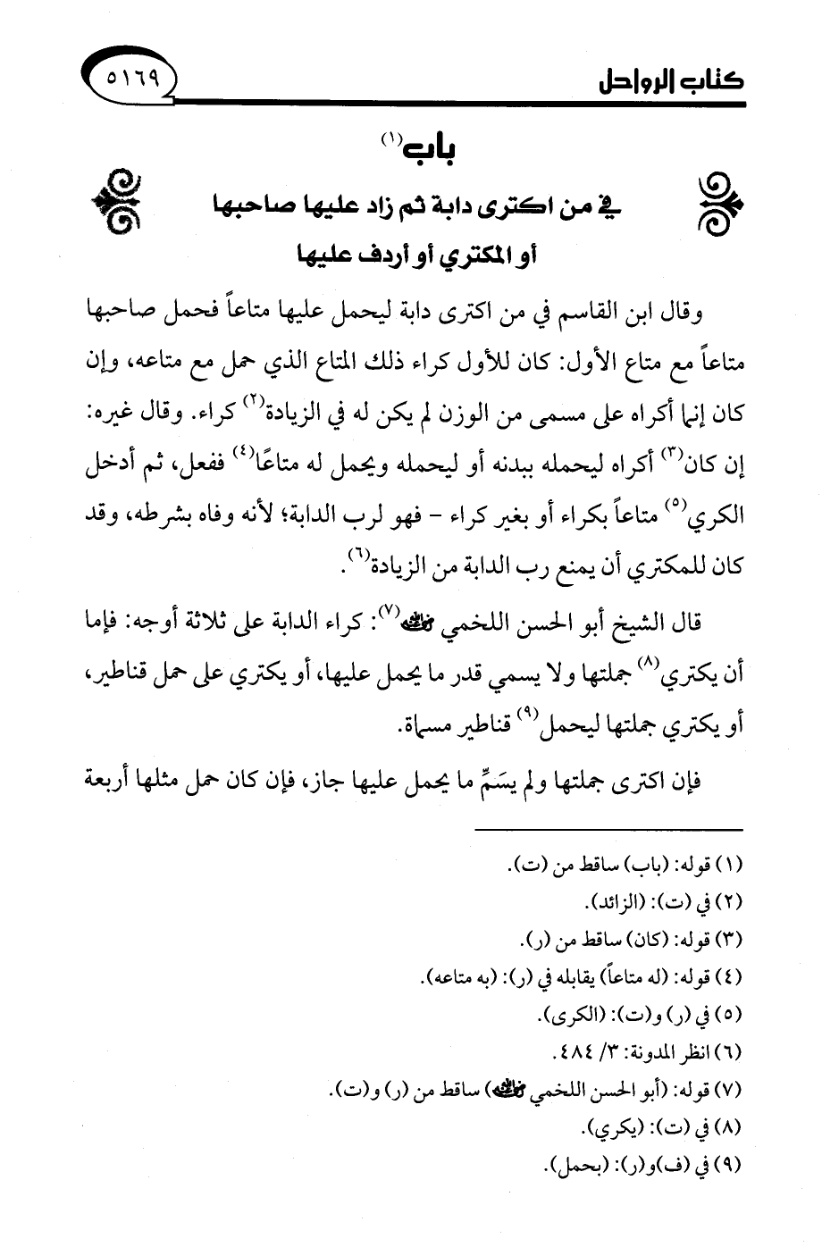 قال الشيخ أبو الحسن اللخمي - رضي الله عنه - (¬7): كراء الدابة على ثلاثة أوجه: فإما أن يكتري (¬8) جملتها ولا يسمي قدر ما يحمل عليها، أو يكتري على حمل قناطير، أو يكتري جملتها ليحمل (¬9) قناطير مسماة.