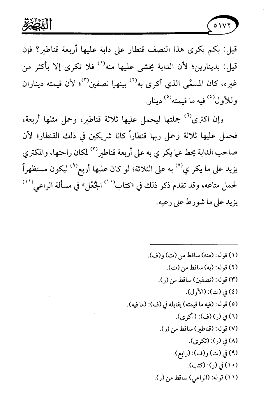 قيل: بكم يكرى هذا النصف قنطار على دابة عليها أربعة قناطير؟ فإن قيل: بدينارين؛ لأنَّ الدابة يخشى عليها منه (¬1) فلا تكرى إلا بأكثر من غيره، كان المسمَّى الذي أكرى به (¬2) بينهما نصفين (¬3)؛ لأنَّ قيمته ديناران وللأول (¬4) فيه ما قيمته (¬5) دينار.