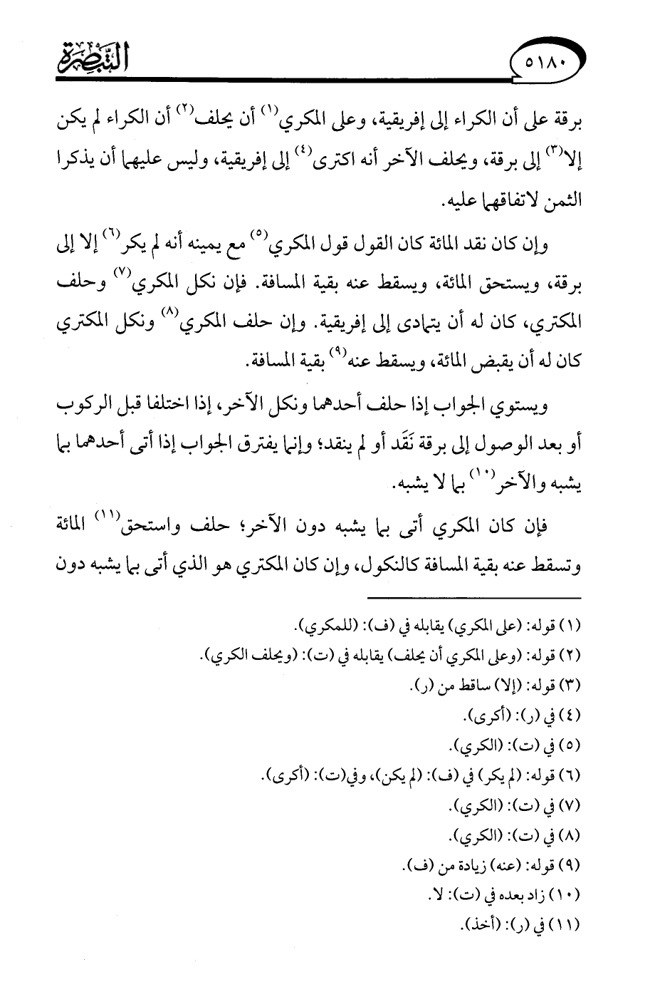 وإن كان نقد المائة كان القول قول المكري (¬5) مع يمينه أنَّه لم يكر (¬6) إلا إلى برقة، ويستحق المائة، ويسقط عنه بقية المسافة. فإن نكل المكري (¬7) وحلف المكتري، كان له أن يتمادى إلى إفريقية. وإن حلف المكري (¬8) ونكل المكتري كان له أن يقبض المائة، ويسقط عنه (¬9) بقية المسافة.