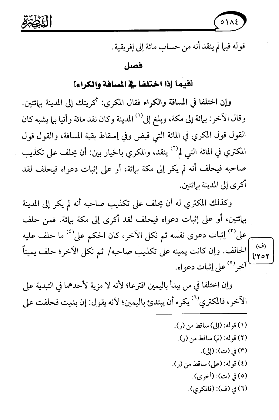 وكذلك المكتري له أن يحلف على تكذيب صاحبه أنَّه لم يكر إلى المدينة بمائتين، أو على إثبات دعواه فيحلف لقد أكرى إلى مكة بمائة. فمن حلف على (¬3) إثبات دعوى نفسه ثمَّ نكل الآخر، كان الحكم على (¬4) ما حلف عليه الحالف. وإن كانت يمينه على تكذيب صاحبه ثمَّ نكل الآخر، حلف يمينًا آخر (¬5) على إثبات دعواه.