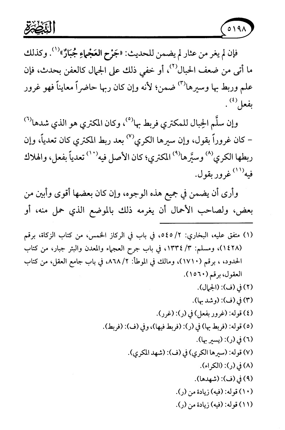 فإن لم يغر من عثار لم يضمن للحديث: "جَرْح العَجْماءِ جُبارٌ" (¬1). وكذلك ما أتى من ضعف الحبال (¬2)، أو خفي ذلك على الجمال كالعفن بحدث، فإن علم وربط بها وسيرها (¬3) ضمن؛ لأنه وإن كان ربها حاضرًا معاينًا فهو غرور بفعل (¬4).