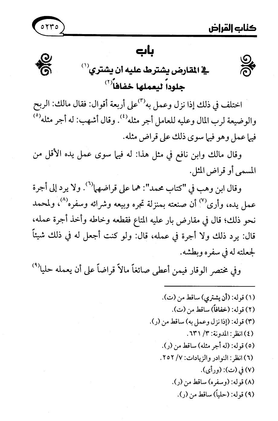 باب فى المقارض يشترط عليه أن يشتري (¬1) جلودًا ليعملها خفافًا (¬2)