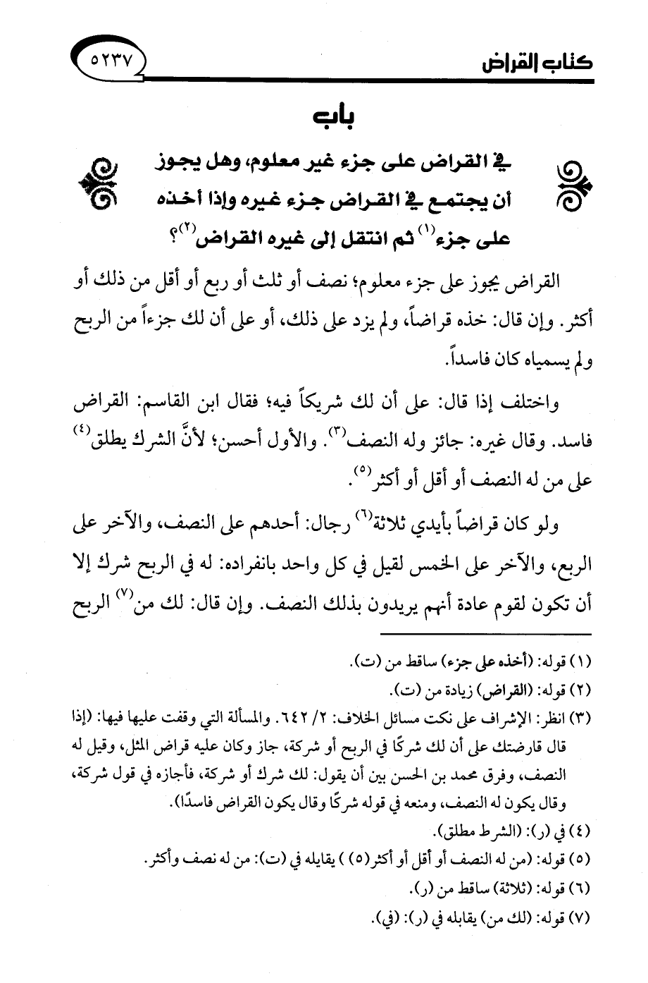 (¬3) انظر: الإشراف على نكت مسائل الخلاف: 2/ 642. والمسألة التي وقفت عليها فيها: (إذا قال قارضتك على أن لك شركًا في الربح أو شركة, جاز وكان عليه قراض المثل، وقيل له النصف، وفرق محمَّد بن الحسن بين أن يقول: لك شرك أو شركة، فأجازه في قول شركة، وقال يكون له النصف، ومنعه في قوله شركًا وقال يكون القراض فاسدًا).