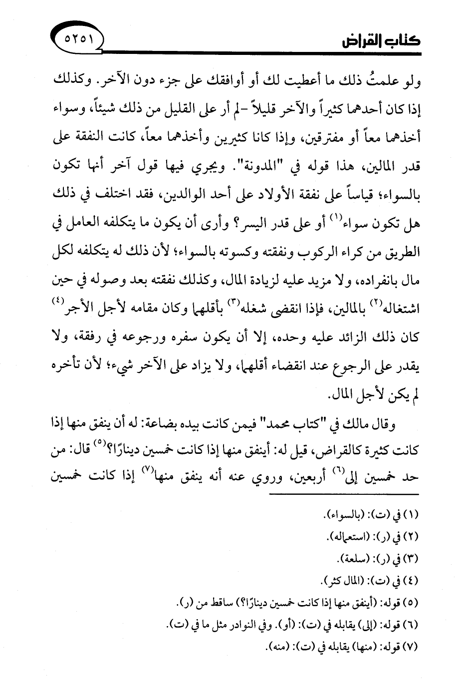 ولو علمتُ ذلك ما أعطيت لك أو أوافقك على جزء دون الآخر. وكذلك إذا كان أحدهما كثيرًا والآخر قليلًا- لم أر على القليل من ذلك شيئًا، وسواء أخذهما معًا أو مفترقين، وإذا كانا كثيرين وأخذهما معًا، كانت النفقة على قدر المالين، هذا قوله في "المدونة". ويجري فيها قول آخر أنها تكون بالسواء، قياسًا على نفقة الأولاد على أحد الوالدين، فقد اختلف في ذلك هل تكون سواء (¬1) أو على قدر اليسر؟ وأرى أن يكون ما يتكلفه العامل في الطريق من كراء الركوب ونفقته وكسوته بالسواء؛ لأن ذلك له يتكلفه لكل مال بانفراده، ولا مزيد عليه لزيادة المال، وكذلك نفقته بعد وصوله في حين اشتغاله (¬2) بالمالين، فإذا انقضى شغله (¬3) بأقلهما وكان مقامه لأجل الأجر (¬4) كان ذلك الزائد عليه وحده، إلا أن يكون سفره ورجوعه في رفقة، ولا يقدر على الرجوع عند انقضاء أقلهما، ولا يزاد على الآخر شيء؛ لأن تأخره لم يكن لأجل المال.