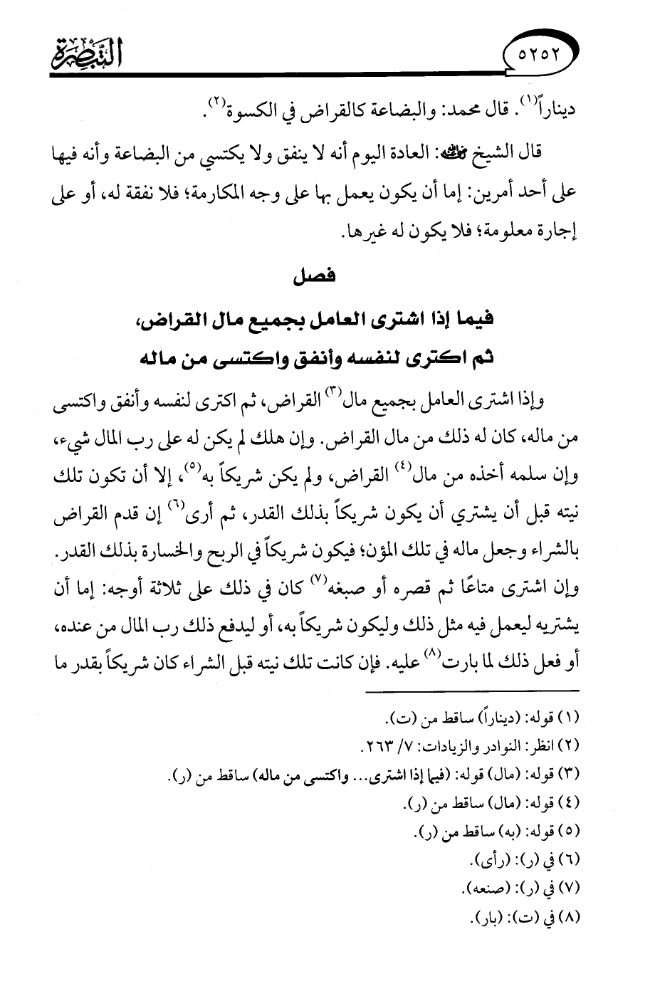 قال الشيخ - رضي الله عنه -: العادة اليوم أنه لا ينفق ولا يكتسي من البضاعة وأنه فيها على أحد أمرين: إما أن يكون يعمل بها على وجه المكارمة، فلا نفقة له، أو على إجارة معلومة، فلا يكون له غيرها.