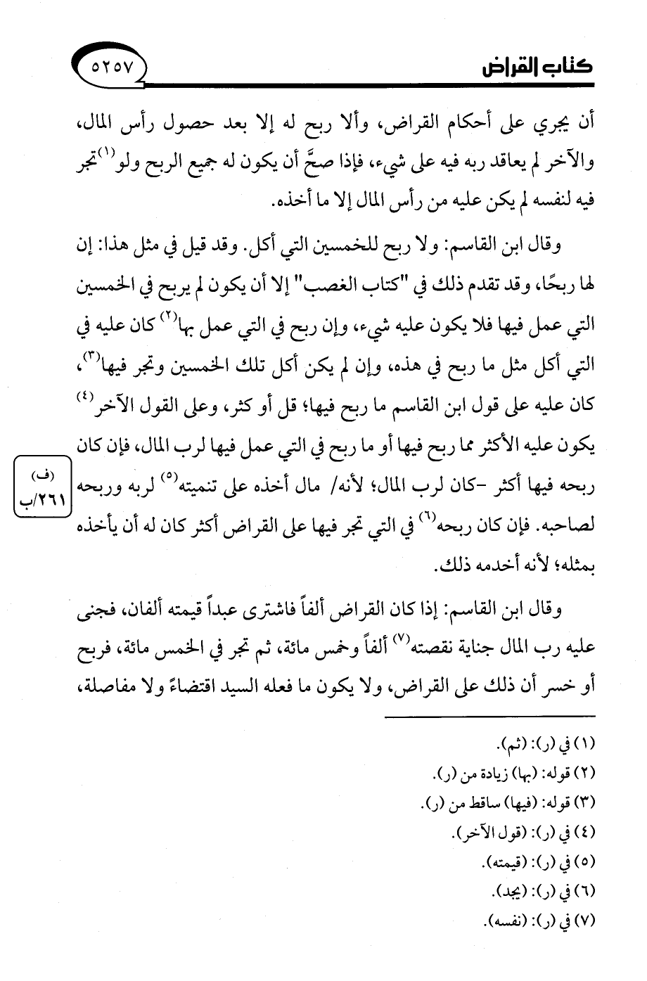 وقال ابن القاسم: إذا كان القراض ألفًا فاشترى عبدًا قيمته ألفان، فجنى عليه رب المال جناية نقصته (¬7) ألفًا وخمس مائة، ثم تجر في الخمس مائة، فربح أو خسر أن ذلك على القراض، ولا يكون ما فعله السيد اقتضاءً ولا مفاصلة،