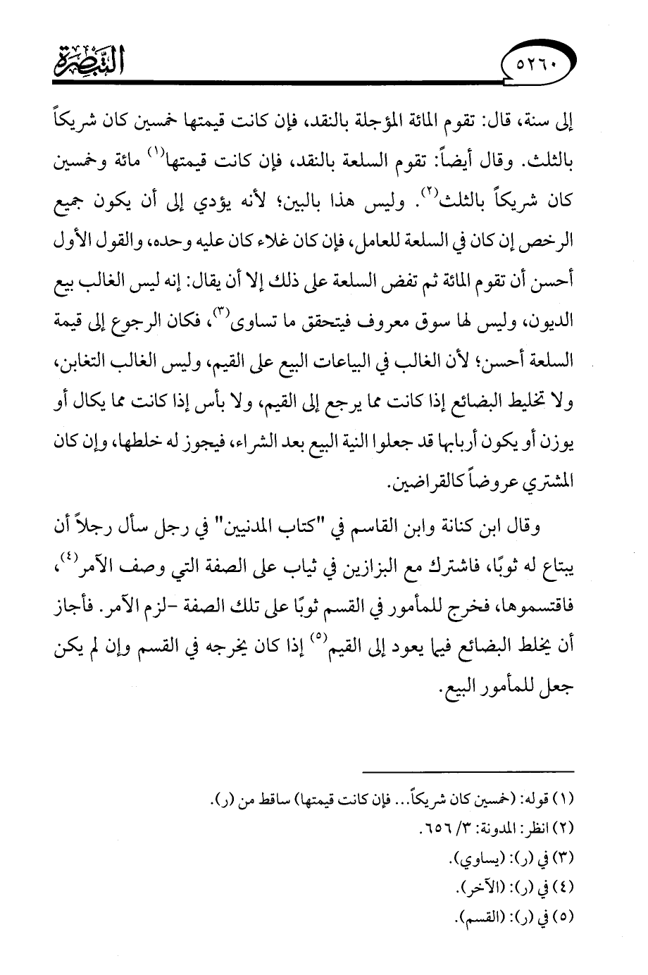 إلى سنة، قال: تقوم المائة المؤجلة بالنقد، فإن كانت قيمتها خمسين كان شريكًا بالثلث. وقال أيضًا: تقوم السلعة بالنقد، فإن كانت قيمتها (¬1) مائة وخمسين كان شريكًا بالثلث (¬2). وليس هذا بالبين؛ لأنه يؤدي إلى أن يكون جميع الرخص إن كان في السلعة للعامل، فإن كان غلاء كان عليه وحده، والقول الأول أحسن أن تقوم المائة ثم تفض السلعة على ذلك إلا أن يقال: إنه ليس الغالب بيع الديون، وليس لها سوق معروف فيتحقق ما تساوى (¬3)، فكان الرجوع إلى قيمة السلعة أحسن؛ لأن الغالب في البياعات البيع على القيم، وليس الغالب التغابن، ولا تخليط البضائع إذا كانت مما يرجع إلى القيم، ولا بأس إذا كانت مما يكال أو يوزن أو يكون أربابها قد جعلوا النية البيع بعد الشراء، فيجوز له خلطها، وإن كان المشتري عروضًا كالقراضين.
