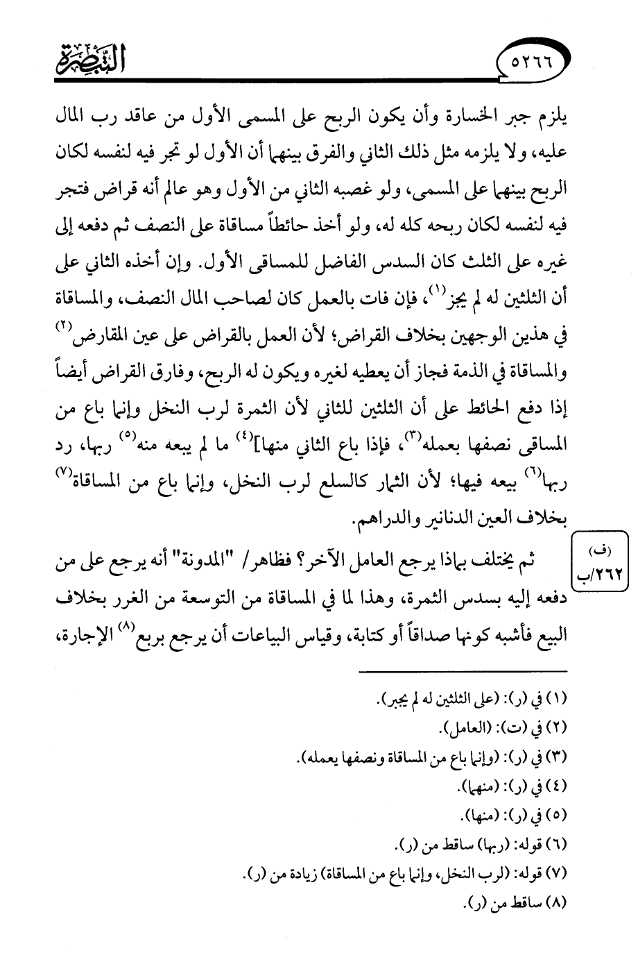يلزم جبر الخسارة وأن يكون الربح على المسمى الأول من عاقد رب المال عليه، ولا يلزمه مثل ذلك الثاني والفرق بينهما أن الأول لو تجر فيه لنفسه لكان الربح بينهما على المسمى، ولو غصبه الثاني من الأول وهو عالم أنه قراض فتجر فيه لنفسه لكان ربحه كله له، ولو أخذ حائطًا مساقاة على النصف ثم دفعه إلى غيره على الثلث كان السدس الفاضل للمساقى الأول. وإن أخذه الثاني على أن الثلثن له لم يجز (¬1)، فإن فات بالعمل كان لصاحب المال النصف، والمساقاة في هذين الوجهين بخلاف القراض؛ لأن العمل بالقراض على عين المقارض (¬2) والمساقاة في الذمة فجاز أن يعطيه لغيره ويكون له الربح، وفارق القراض أيضًا إذا دفع الحائط على أن الثلثين للثاني لأن الثمرة لرب النخل وإنما باع من المساقى نصفها بعمله (¬3)، فإذا باع الثاني منها] (¬4) ما لم يبعه منه (¬5) ربها، رد ربها (¬6) بيعه فيها؛ لأن الثمار كالسلع لرب النخل، وإنما باع من المساقاة (¬7) بخلاف العين الدنانير والدراهم.