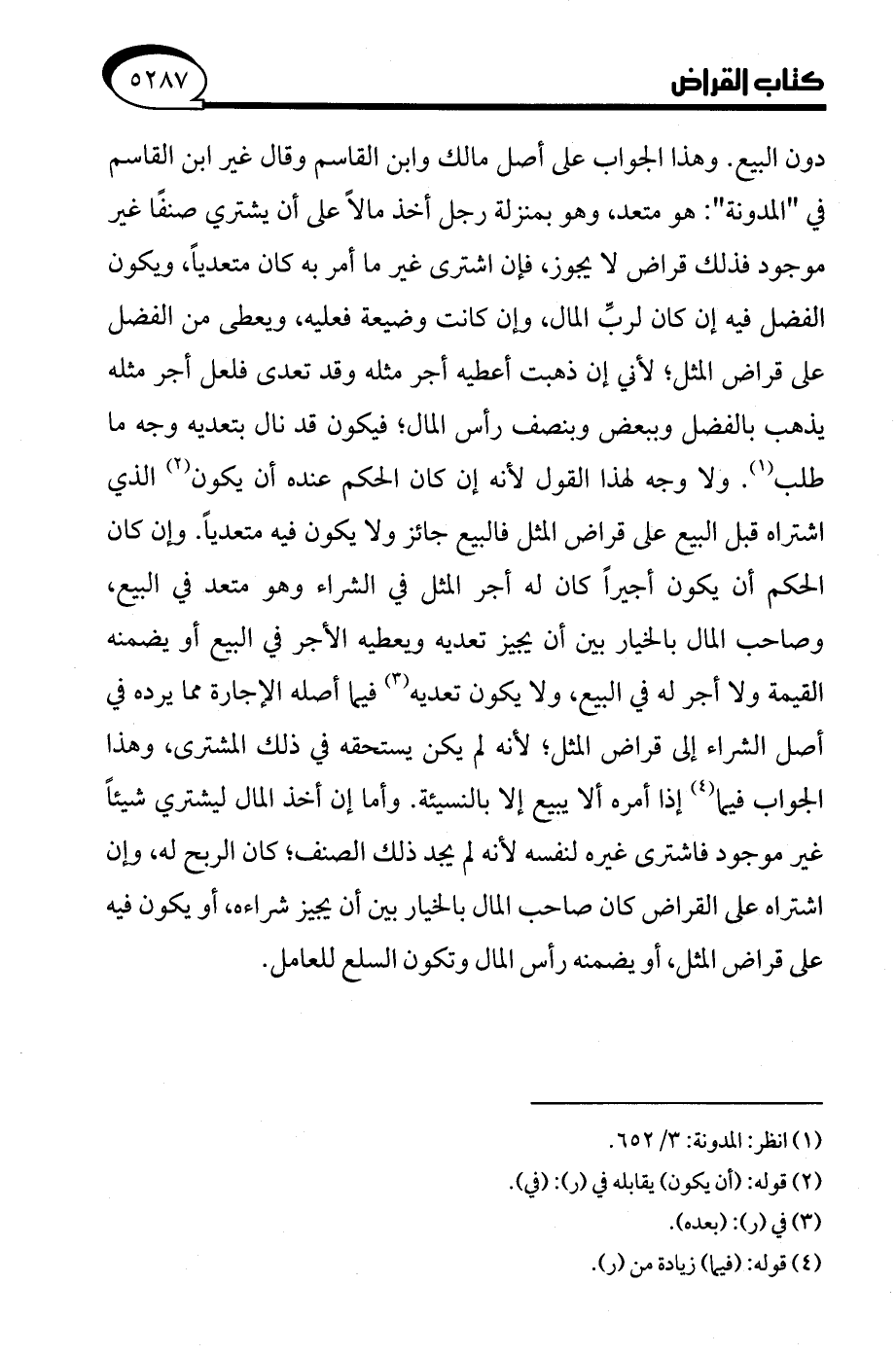دون البيع. وهذا الجواب على أصل مالك وابن القاسم وقال غير ابن القاسم في "المدونة": هو متعد، وهو بمنزلة رجل أخذ مالًا على أن يشتري صنفًا غير موجود فذلك قراض لا يجوز، فإن اشترى غير ما أمر به كان متعديًا، ويكون الفضل فيه إن كان لربِّ المال، وإن كانت وضيعة فعليه، ويعطى من الفضل على قراض المثل؛ لأني إن ذهبت أعطيه أجر مثله وقد تعدى فلعل أجر مثله يذهب بالفضل وببعض وبنصف رأس المال، فيكون قد نال بتعديه وجه ما طلب (¬1). ولا وجه لهذا القول لأنه إن كان الحكم عنده أن يكون (¬2) الذي اشتراه قبل البيع على قراض المثل فالبيع جائز ولا يكون فيه متعديًا. وإن كان الحكم أن يكون أجيرًا كان له أجر المثل في الشراء وهو متعد في البيع، وصاحب المال بالخيار بكان أن يجيز تعديه ويعطيه الأجر في البيع أو يضمنه القيمة ولا أجر له في البيع، ولا يكون تعديه (¬3) فيما أصله الإجارة مما يرده في أصل الشراء إلى قراض المثل؛ لأنه لم يكن يستحقه في ذلك المشترى، وهذا الجواب فيما (¬4) إذا أمره ألا يبيع إلا بالنسيئة. وأما إن أخذ المال ليشتري شيئًا غير موجود فاشترى غيره لنفسه لأنه لم يجد ذلك الصنف، كان الربح له، وإن اشتراه على القراض كان صاحب المال بالخيار بين أن يجيز شراءه، أو يكون فيه على قراض المثل، أو يضمنه رأس المال وتكون السلع للعامل.