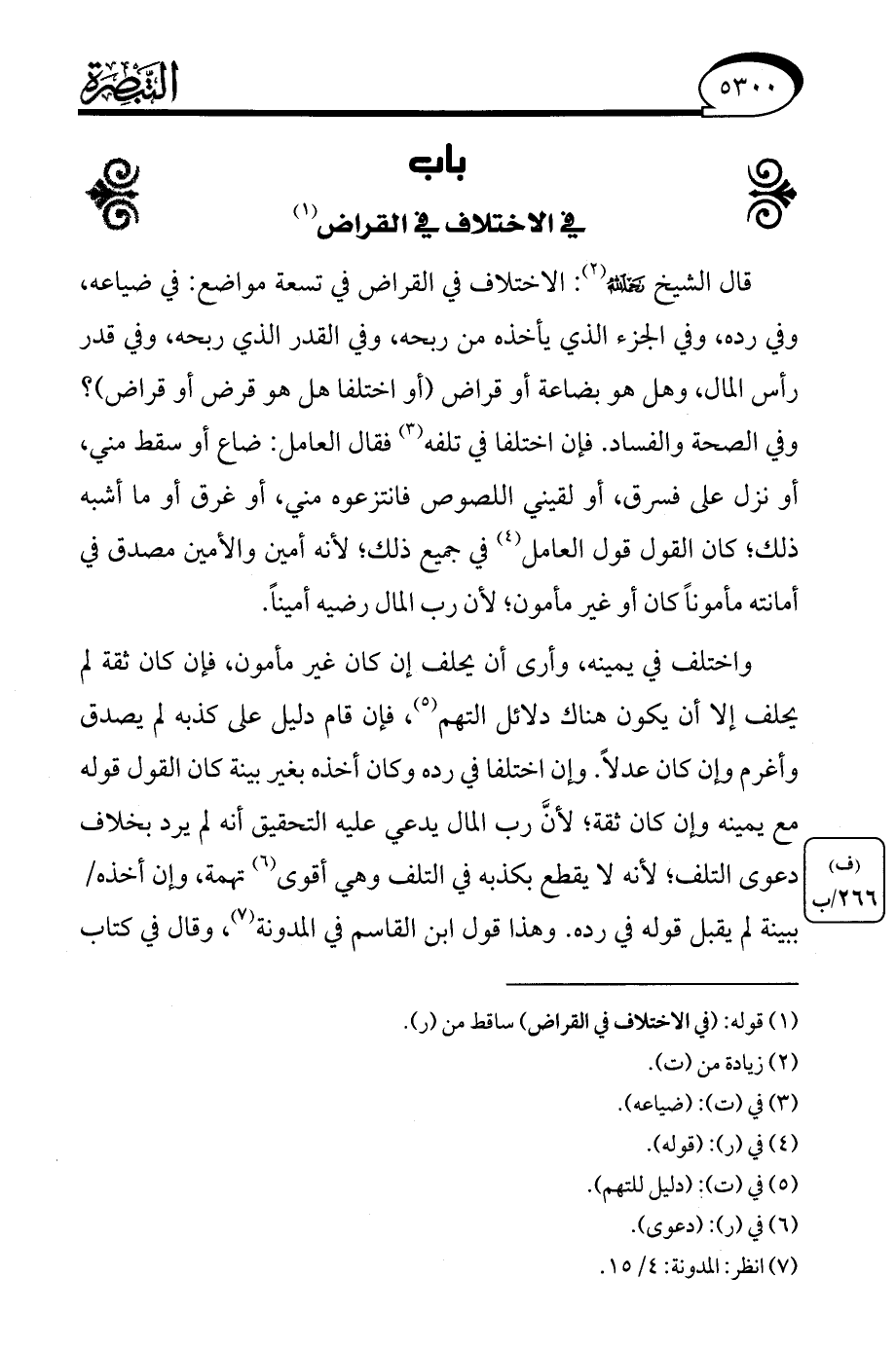 واختلف في يمينه، وأرى أن يحلف إن كان غير مأمون، فإن كان ثقة لم يحلف إلا أن يكون هناك دلائل التهم (¬5)، فإن قام دليل على كذبه لم يصدق وأغرم وإن كان عدلًا. وإن اختلفا في رده وكان أخذه بغير بينة كان القول قوله مع يمينه وإن كان ثقة؛ لأنَّ رب المال يدعي عليه التحقيق أنه لم يرد بخلاف دعوى التلف؛ لأنه لا يقطعَّ بكذبه في التلف وهي أقوى (¬6) تهمة، وإن أخذه ببينة لم يقبل قوله في رده. وهذا قول ابن القاسم في المدونة (¬7)، وقال في كتاب