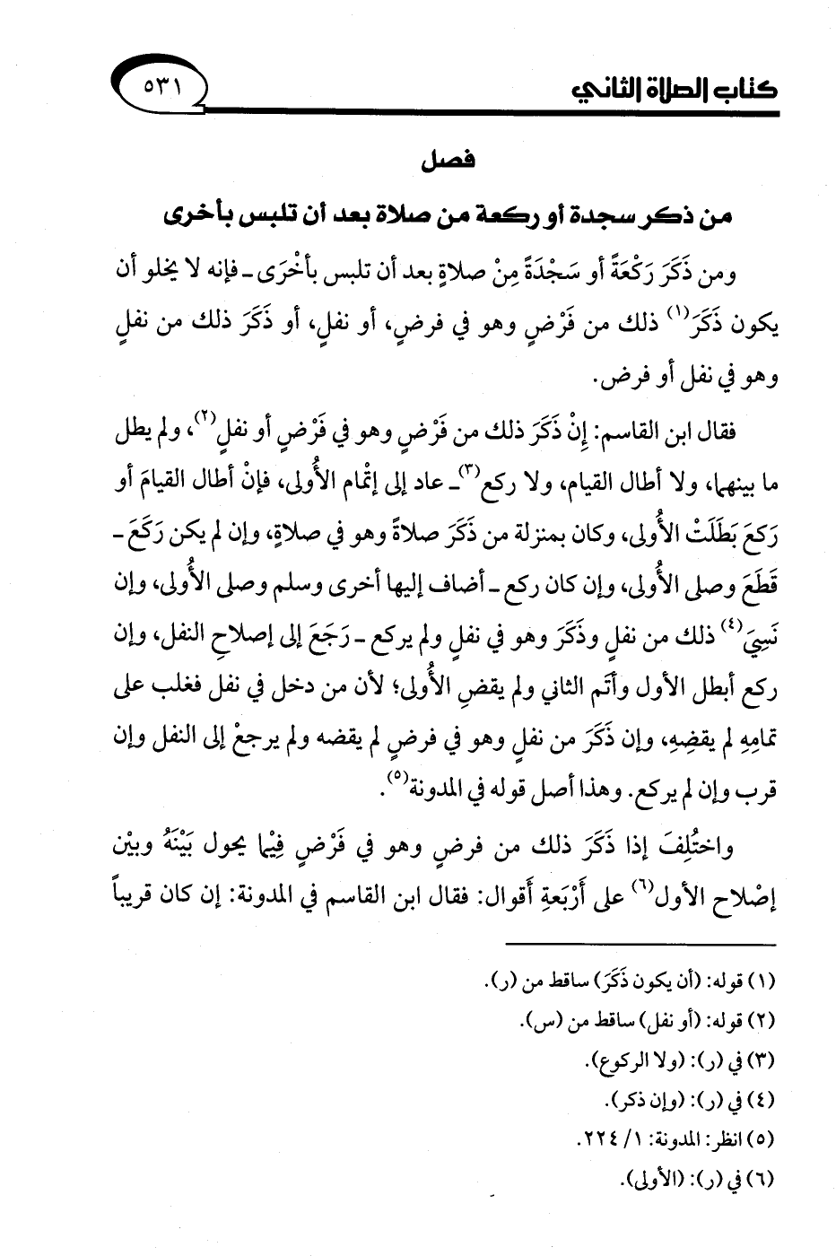 واختُلِفَ إذا ذَكَرَ ذلك من فرضٍ وهو في فَرْضٍ فِيْما يحول بَيْنَهُ وبيْن إصْلاح الأول (¬6) على أَرْبَعةِ أَقوال: فقال ابن القاسم في المدونة: إن كان قريبًا