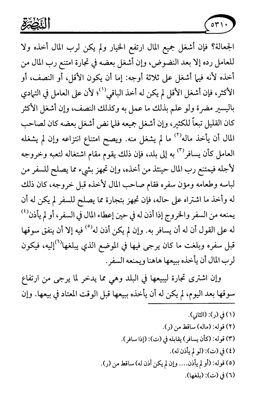الجعالة؟ فإن أشغل جميع المال ارتفع الخيار ولم يكن لرب المال أخذه ولا للعامل رده إلا بعد النضوض، وإن أشغل بعضه في تجارة امتنع رب المال من أخذه لأنه فيما أشغل على ثلاثة أوجه: إما أن يكون الأقل، أو النصف، أو الأكثر، فإن أشغل الأقل لم يكن له أخذ الباقي (¬1)؛ لأن على العامل في التمادي باليسير مضرة ولو علم بذلك ما عمل به وكذلك النصف، وإن أشغل الأكثر كان القليل تبعًا للكثير، وإن أشغل جميعه فلما نض أشغل بعضه كان لصاحب المال أن يأخذ ماله (¬2) ما لم يشغل منه. ويصح امتناع انتزاعه وإن لم يشغله العامل كأن يسافر (¬3) به إلى بلد، فإن ذلك يقوم مقام اشتغاله لتعبه وخروجه لأجله فيمتنع رب المال حينئذ من أخذه، وإن تجهز بشيء مما يصلح للسفر من لباسه وطعامه ومؤن سفره فقام صاحب المال لأخذه قبل خروجه، كان ذلك له وأخذ ما اشتراه على حاله، فإن تجهز بتجارة مما يصلح للسفر لم يكن له أن يمنعه من السفر والخروج إذا أذن له في حين إعطاء المال في السفر، أو لم يأذن (¬4) له على القول أن له أن يسافر به. وإن لم يكن أذن له ((¬5) فيه إلا أن ينفق سوقها قبل سفره وبلغت ما كان يرجى فيها في الموضع الذي يبلغها (¬6) إليه، فيكون لرب المال أن يأخذه ببيعها ها هنا ويمنعه السفر.