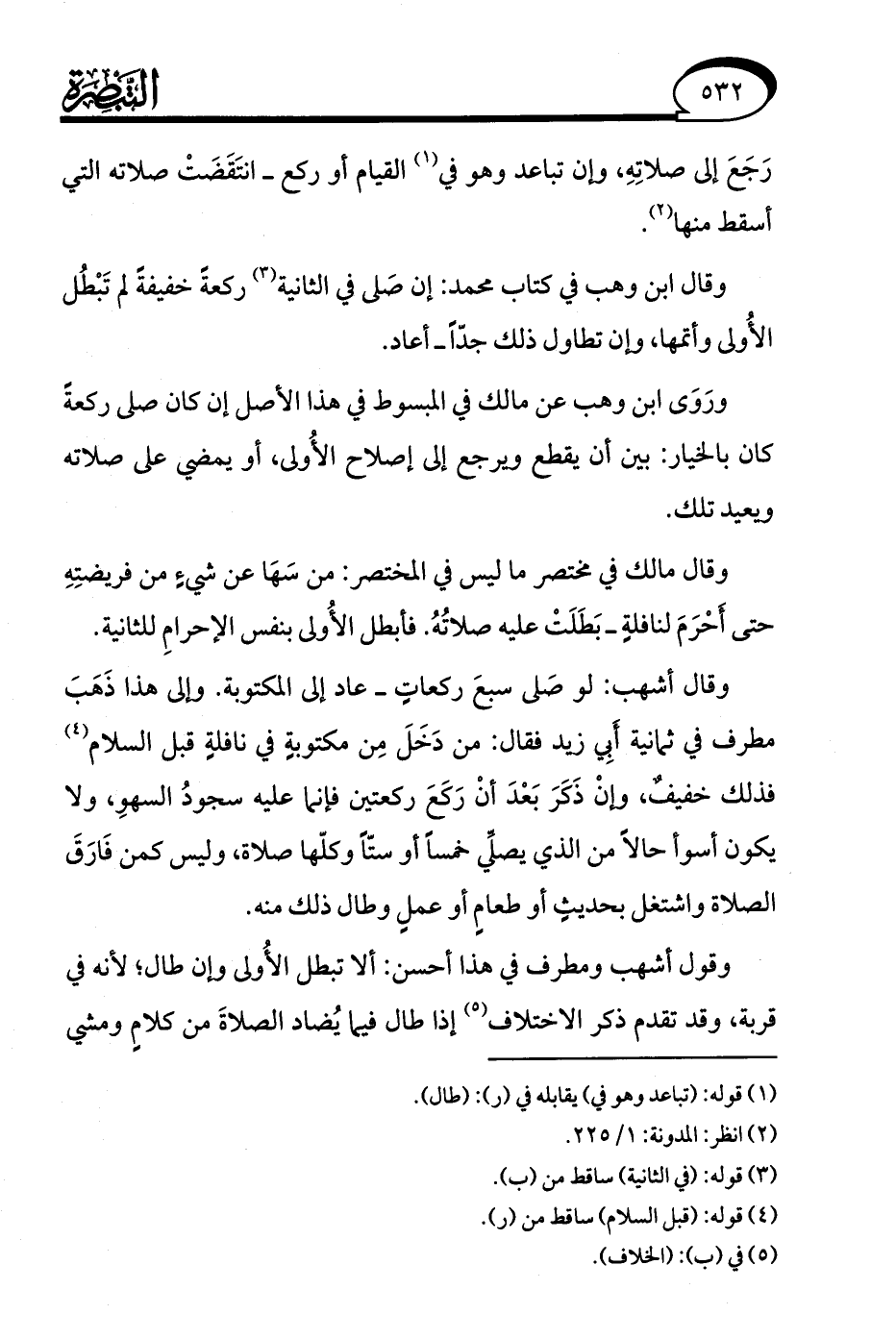 وقال مالك في مختصر ما ليس في المختصر: من سَهَا عن شيءٍ من فريضتِهِ حتى أَحْرَمَ لنافلةٍ - بَطَلَتْ عليه صلاتُهُ. فأبطل الأُصلى بنفس الإحرامِ للثانية.