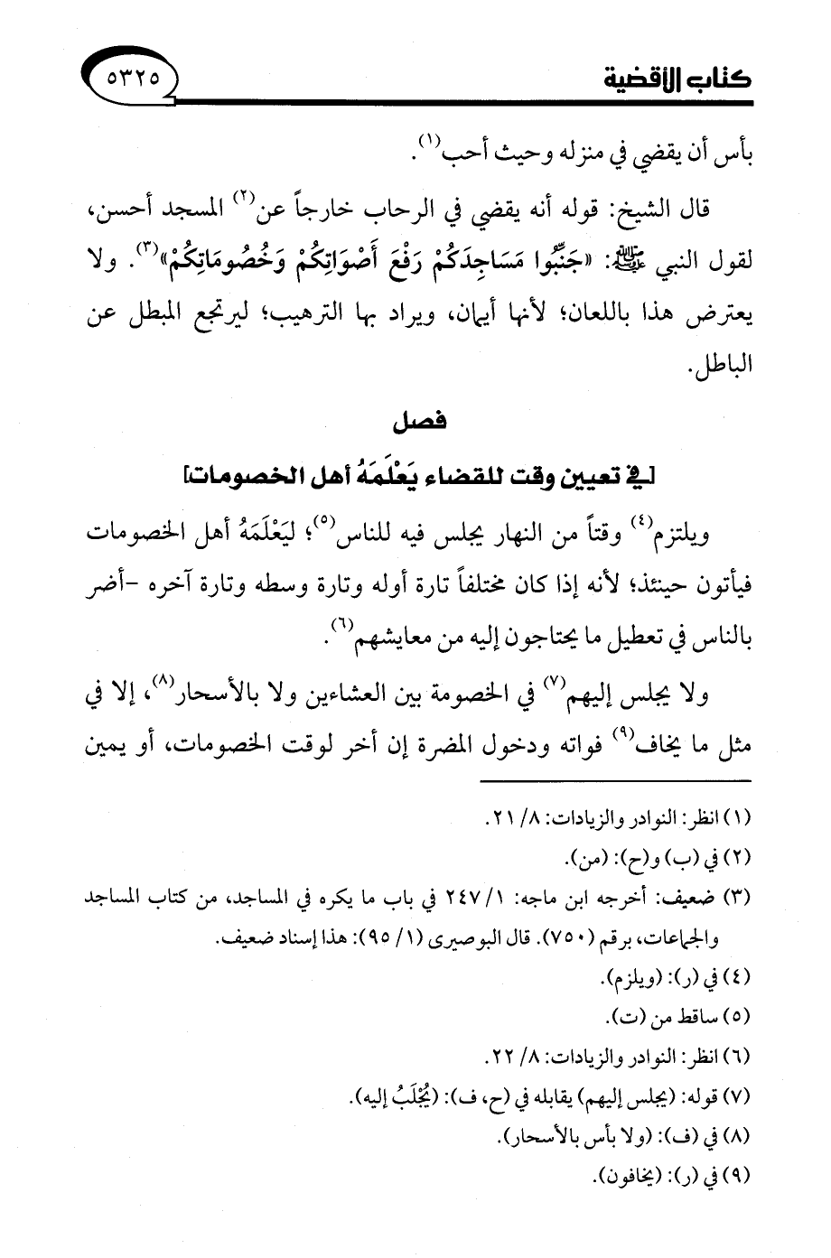 قال الشيخ: قوله أنه يقضي في الرحاب خارجًا عن (¬2) المسجد أحسن، لقول النبي - صلى الله عليه وسلم -: "جَنِّبُوا مَسَاجِدَكُمْ رَفْعَ أَصْوَاتِكُمْ وَخُصُومَاتِكُمْ" (¬3). ولا يعترض هذا باللعان؛ لأنها أيمان، ويراد بها الترهيب؛ ليرتجع المبطل عن الباطل.