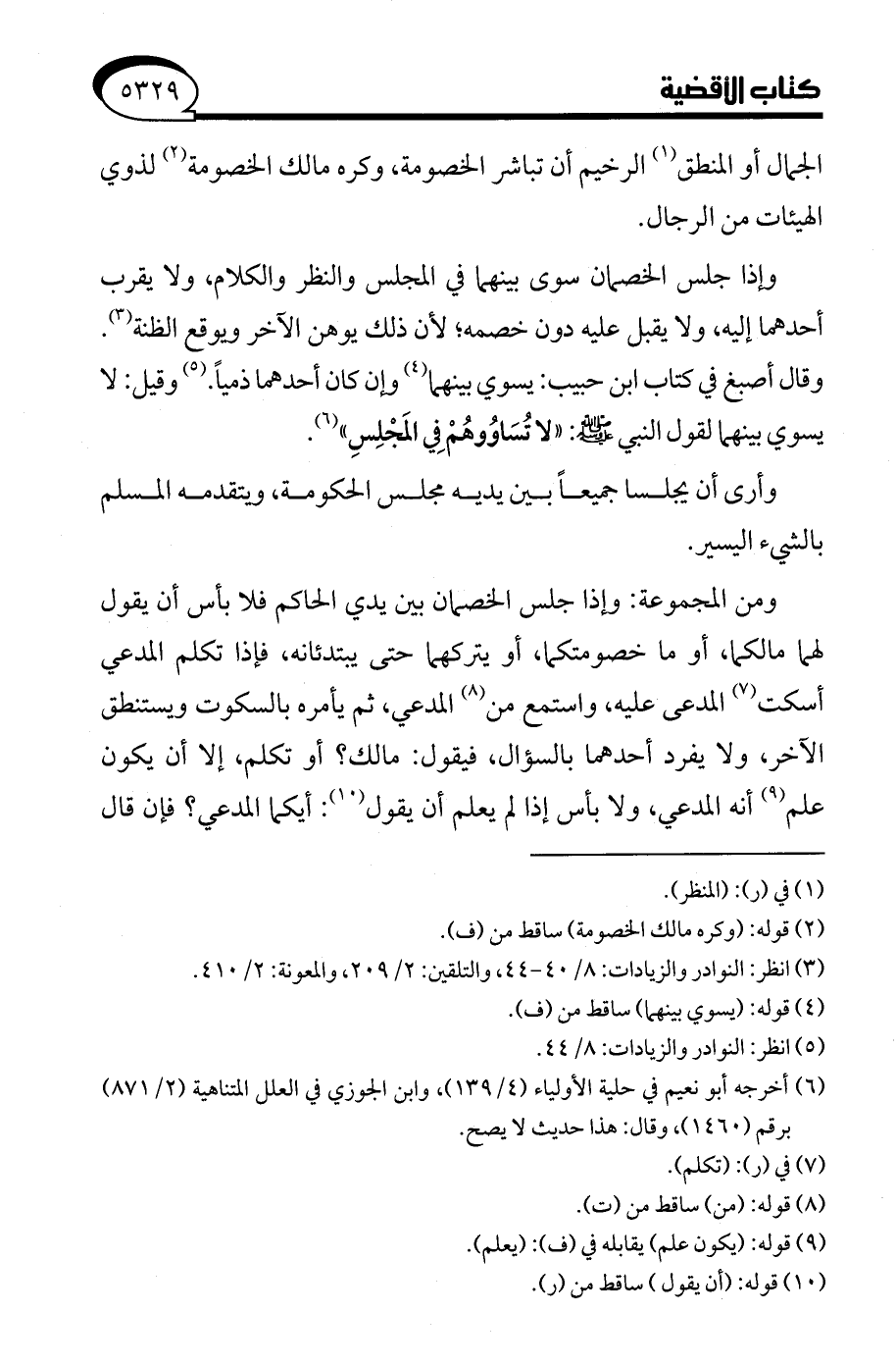وإذا جلس الخصمان سوى بينهما في المجلس والنظر والكلام، ولا يقرب أحدهما إليه، ولا يقبل عليه دون خصمه؛ لأن ذلك يوهن الآخر ويوقع الظنة (¬3). وقال أصبغ في كتاب ابن حبيب: يسوي بينهما (¬4) وإن كان أحدهما ذميًا. (¬5) وقيل: لا يسوي بينهما لقول النبي - صلى الله عليه وسلم -: "لا تُسَاوُوهُمْ فِي المَجْلِسِ" (¬6).