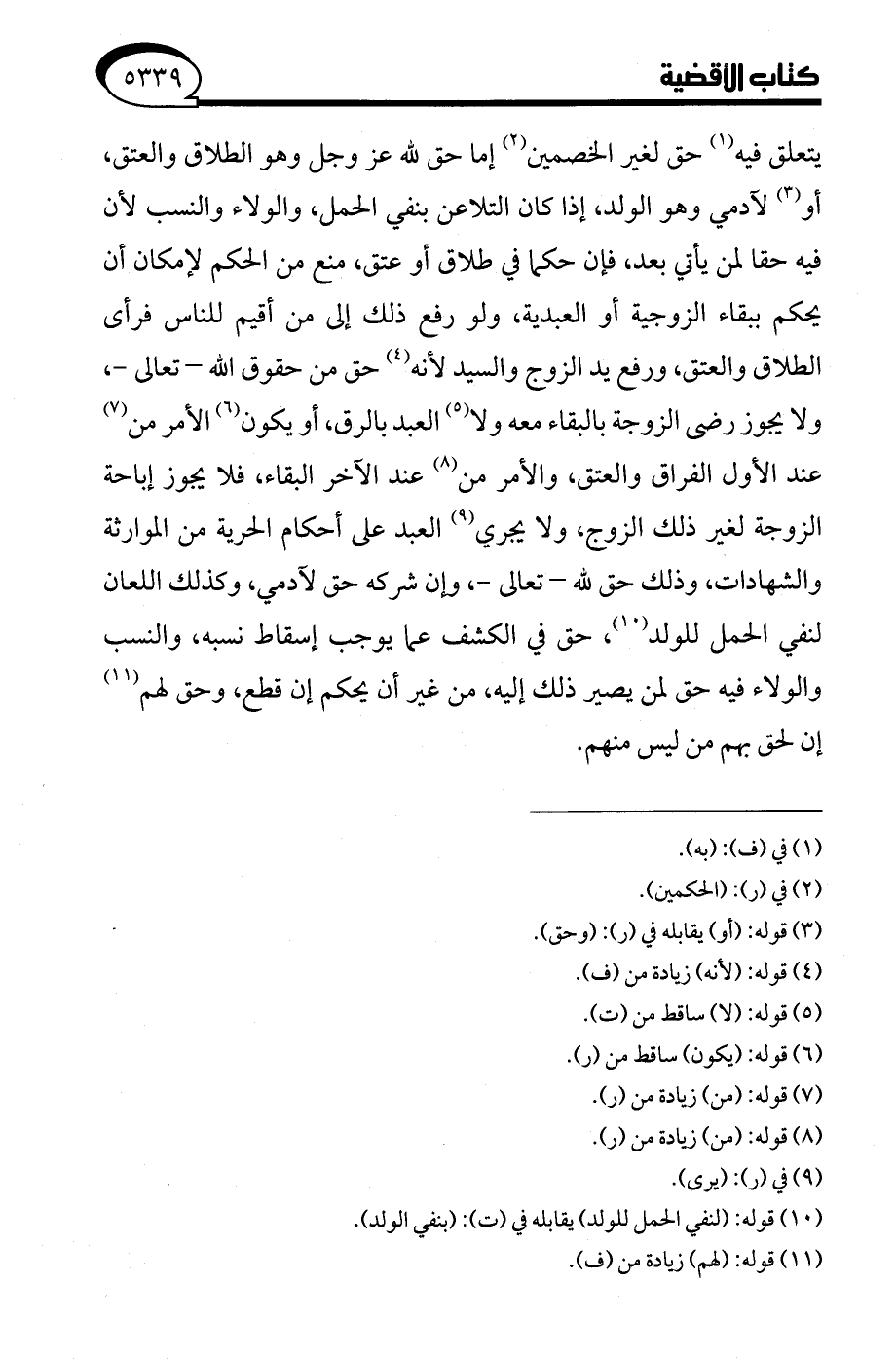 يتعلق فيه (¬1) حق لغير الخصمين (¬2) إما حق لله عز وجل وهو الطلاق والعتق، أو (¬3) لآدمي وهو الولد، إذا كان التلاعن بنفي الحمل، والولاء والنسب لأن فيه حقا لمن يأتي بعد، فإن حكما في طلاق أو عتق، منع من الحكم لإمكان أن يحكم ببقاء الزوجية أو العبدية، ولو رفع ذلك إلى من أقيم للناس فرأى الطلاق والعتق، ورفع يد الزوج والسيد لأنه (¬4) حق من حقوق الله -تعالى-، ولا يجوز رضى الزوجة بالبقاء معه ولا (¬5) العبد بالرق، أو يكون (¬6) الأمر من (¬7) عند الأول الفراق والعتق، والأمر من (¬8) عند الآخر البقاء، فلا يجوز إباحة الزوجة لغير ذلك الزوج، ولا يجري (¬9) العبد على أحكام الحرية من الموارثة والشهادات، وذلك حق لله -تعالى-، وإن شركه حق لآدمي، وكذلك اللعان لنفي الحمل للولد (¬10)، حق في الكشف عفا يوجب إسقاط نسبه، والنسب والولاء فيه حق لمن يصير ذلك إليه، من غير أن يحكم إن قطع، وحق لهم (¬11) إن لحق بهم من ليس منهم.