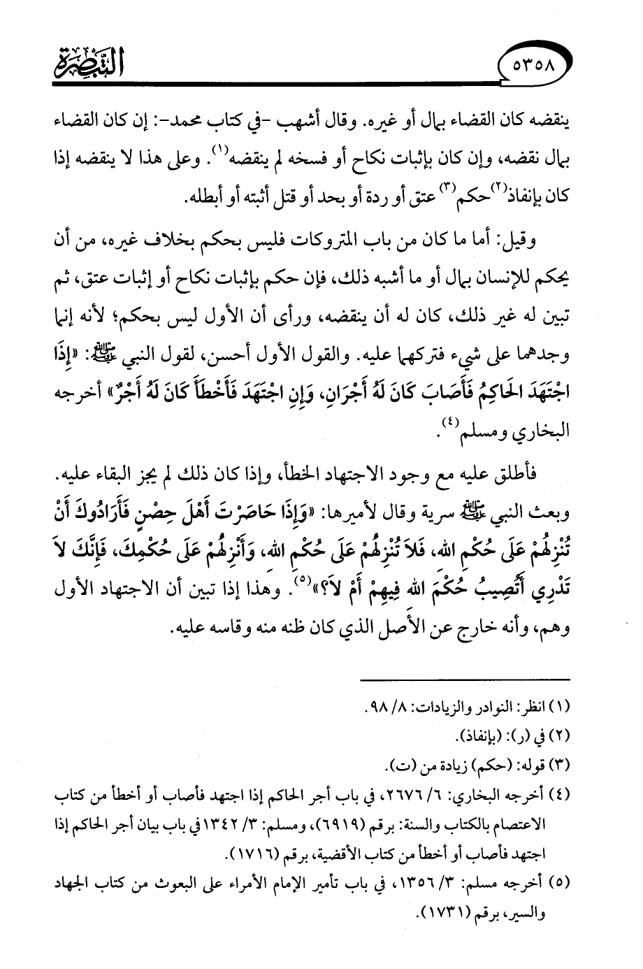 وقيل: أما ما كان من باب المتروكات فليس بحكم بخلاف غيره، من أن يحكم للإنسان بمال أو ما أشبه ذلك، فإن حكم بإثبات نكاح أو إثبات عتق، ثم تبين له غير ذلك، كان له أن ينقضه، ورأى أن الأول ليس بحكم؛ لأنه إنما وجدهما على شيء فتركهما عليه. والقول الأول أحسن، لقول النبي - صلى الله عليه وسلم -: "إِذَا اجْتَهَدَ الحَاكِمُ فَأَصَابَ كَانَ له أَجْرَانِ، وإنِ اجْتَهَدَ فَأَخْطأَ كَانَ لَهُ أَجْرٌ" أخرجه البخاري ومسلم (¬4).