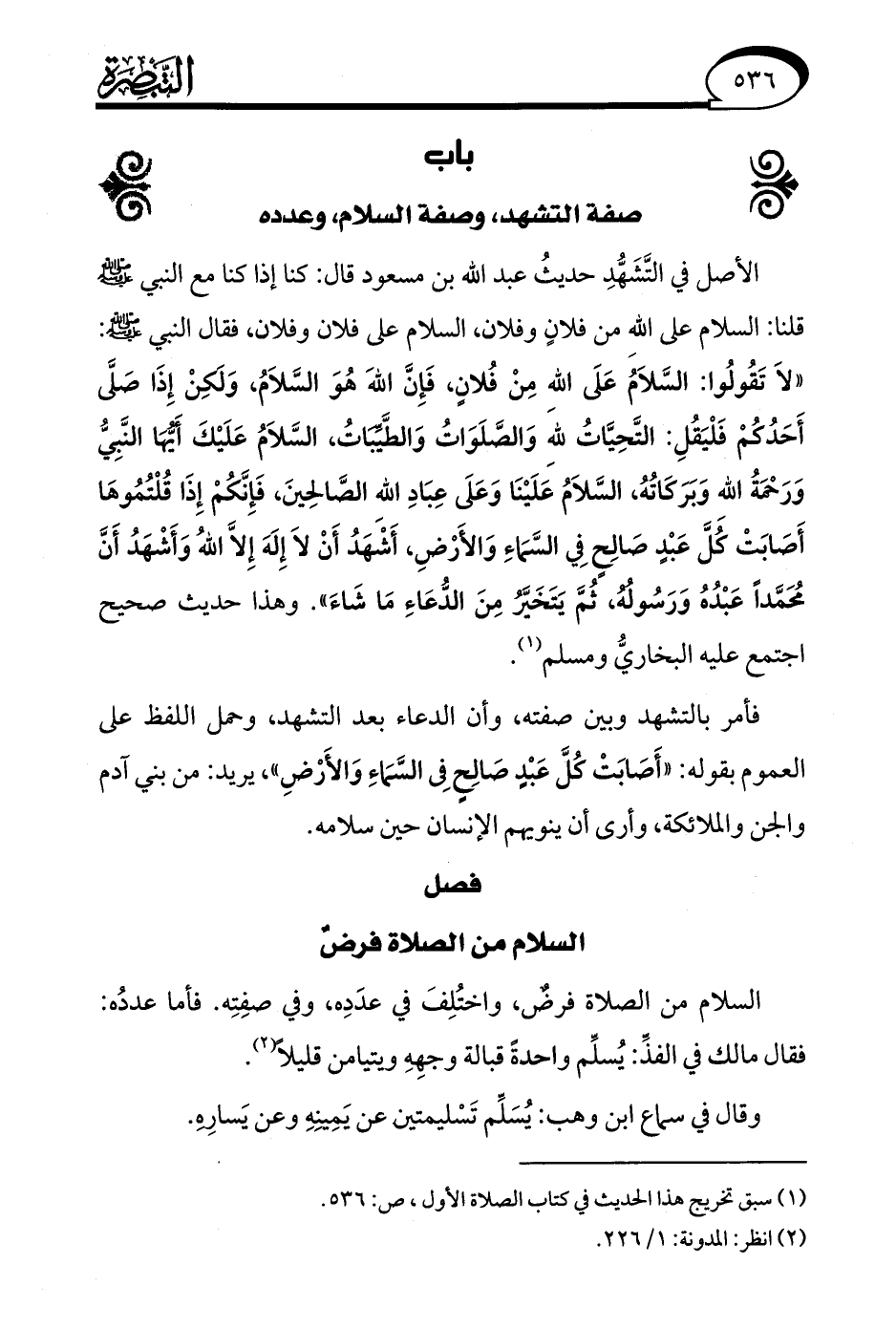 السلام من الصلاة فرضٌ، واختُلِفَ في عدَدِه، وفي صفِتِه. فأما عددُه: فقال مالك في الفذِّ: يُسلِّم واحدةً قبالة وجهِهِ ويتيامن قليلًا (¬2).