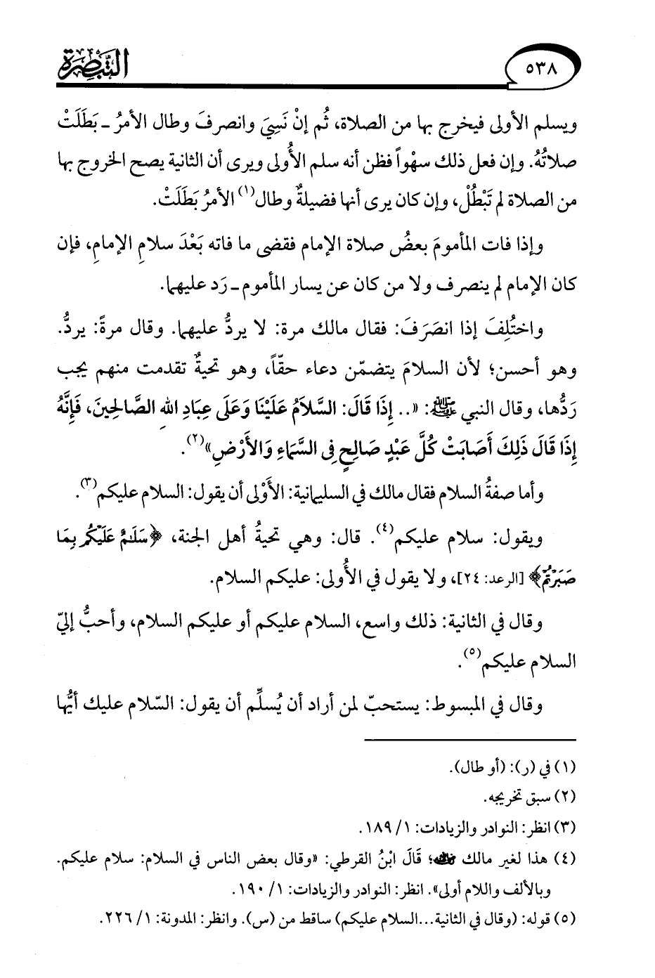(¬4) هذا لغير مالك - رضي الله عنه -؛ قَالَ ابْنُ القرطي: "وقال بعض الناس في السلام: سلام عليكم. وبالألف واللام أولى". انظر: النوادر والزيادات: 1/ 190.