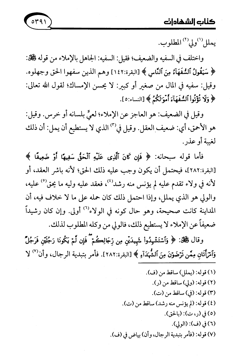 واختلف في السفيه والضعيف، فقيل: السفيه: الجاهل بالإملاء من قوله -عز وجل-: {سَيَقُولُ السُّفَهَاءُ مِنَ النَّاسِ} [البقرة: 142] وهم الذين سفهوا الحق وجهلوه. وقيل: سفيه في المال من صغير أو كبير: لا يحسن الإمساك، لقول الله تعالى: {وَلَا تُؤْتُوا السُّفَهَاءَ أَمْوَالَكُمُ} [النساء: 5].