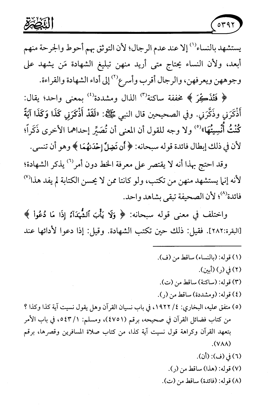 {فَتُذَكِّرَ} مخففة ساكنة (¬3) الذال ومشددة (¬4) بمعنى واحد، يقال: أَذْكَرَني وذَكَّرَني. وفي الصحيحين قال النبي - صلى الله عليه وسلم -: "لَقَدْ أَذْكرَني كَذَا وَكَذَا آيَةً كُنْتُ أُنْسِيتُهَا" (¬5) ولا وجه للقول أن المعنى أن تُصَيِّر إحداهما الأخرى ذَكَرًا؛ لأن في ذلك إبطال فائدة قوله سبحانه: {أَنْ تَضِلَّ إِحْدَاهُمَا} وهو أن تنسى.