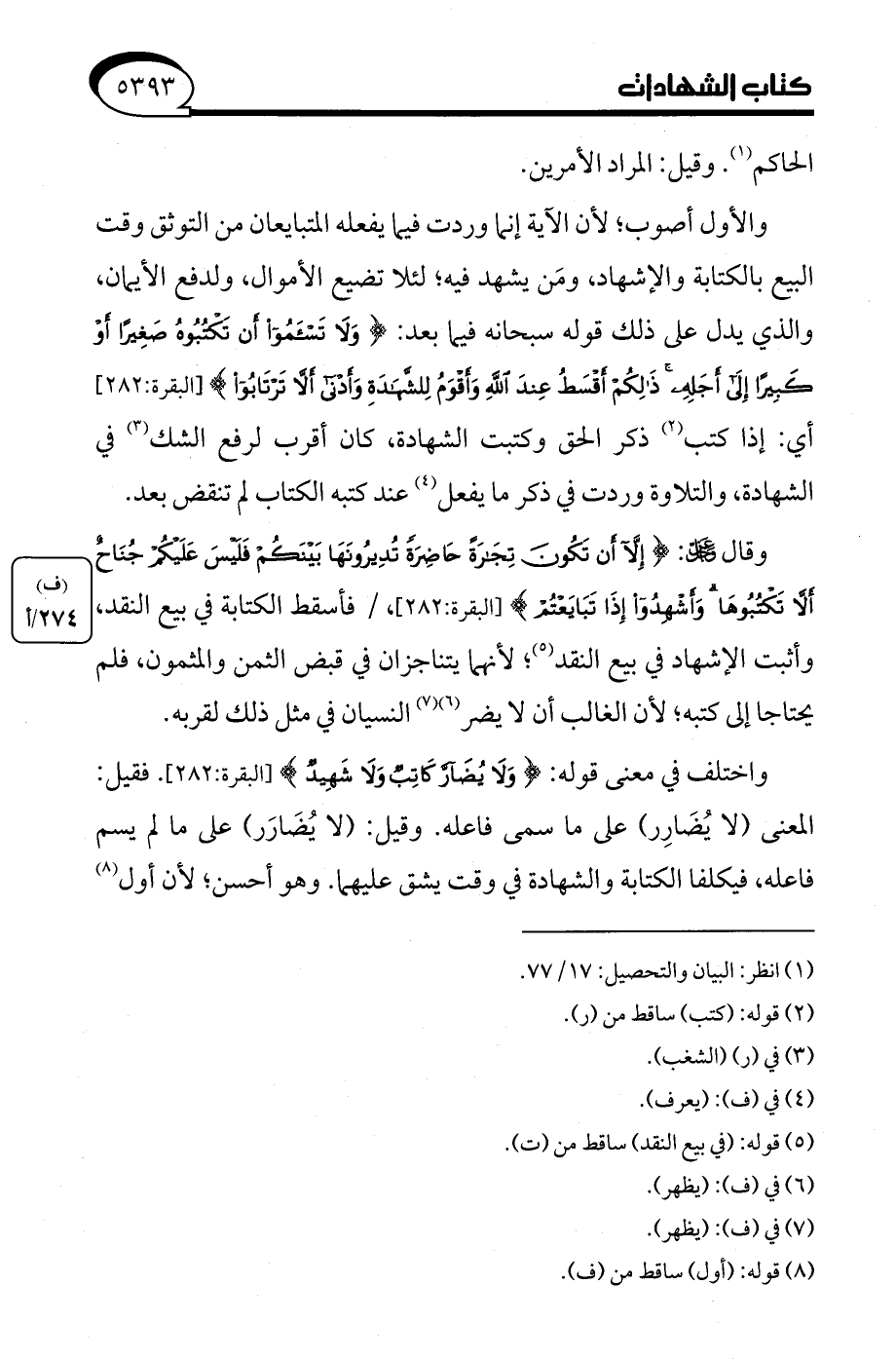 والأول أصوب؛ لأن الآية إنما وردت فيما يفعله المتبايعان من التوثق وقت البيع بالكتابة والإشهاد، ومَن يشهد فيه، لئلا تضيع الأموال، ولدفع الأيمان، والذي يدل على ذلك قوله سبحانه فيما بعد: {وَلَا تَسْأَمُوا أَنْ تَكْتُبُوهُ صَغِيرًا أَوْ كَبِيرًا إِلَى أَجَلِهِ ذَلِكُمْ أَقْسَطُ عِنْدَ اللَّهِ وَأَقْوَمُ لِلشَّهَادَةِ وَأَدْنَى أَلَّا تَرْتَابُوا} [البقرة: 282] أي: إذا كتب (¬2) ذكر الحق وكتبت الشهادة، كان أقرب لرفع الشك (¬3) في الشهادة، والتلاوة وردت في ذكر ما يفعل (¬4) عند كتبه الكتاب لم تنقض بعد.