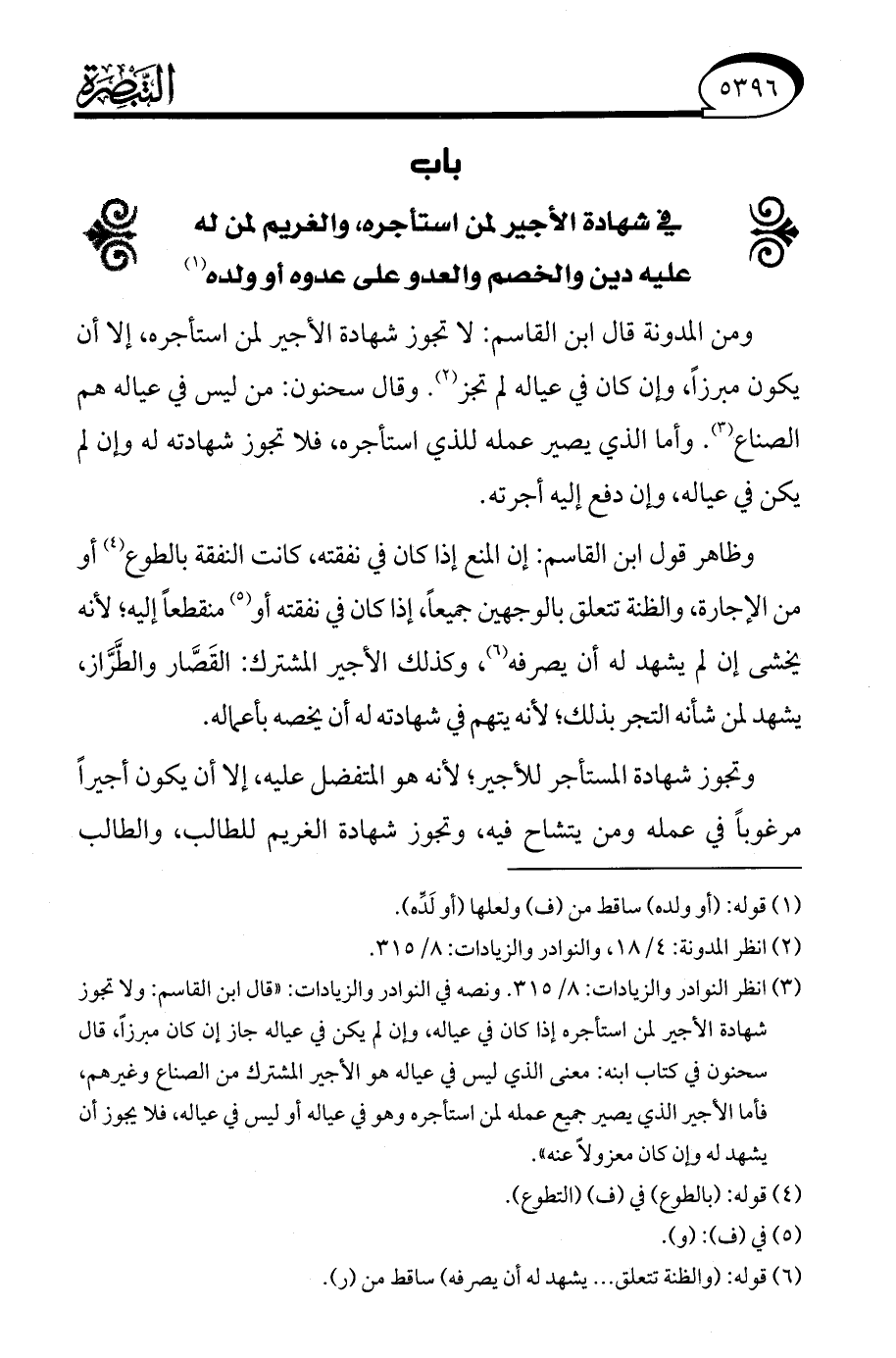 (¬3) انظر النوادر والزيادات: 8/ 315. ونصه في النوادر والزيادات: "قال ابن القاسم: ولا تجوز شهادة الأجير لمن استأجره إذا كان في عياله، كان لم يكن في عياله جاز إن كان مبرزًا، قال سحنون في كتاب ابنه: معنى الذي ليس في عياله هو الأجير المشترك من الصناع وغيرهم، فأما الأجير الذي يصير جميع عمله لمن استأجره وهو في عياله أو ليس في عياله، فلا يجوز أن يشهد له وإن كان معزولًا عنه".