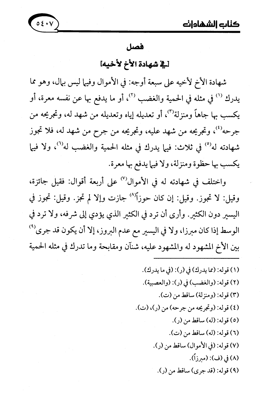 شهادة الأخ لأخيه على سبعة أوجه: في الأموال وفيما ليس بمال، وهو مما يدرك (¬1) في مثله في الحمية والغضب (¬2)، أو ما يدفع بها عن نفسه معرة، أو يكسب بها جاهًا ومنزلة (¬3)، أو تعديله إياه وتعديله من شهد له، وتجريحه من جرحه (¬4)، وتجريحه من شهد عليه، وتجريحه من جرح من شهد له، فلا تجوز شهادته له (¬5) في ثلاث: فيما يدرك في مثله الحمية والغضب له (¬6)، ولا فيما يكسب بها حظوة ومنزلة، ولا فيما يدفع بها معرة.