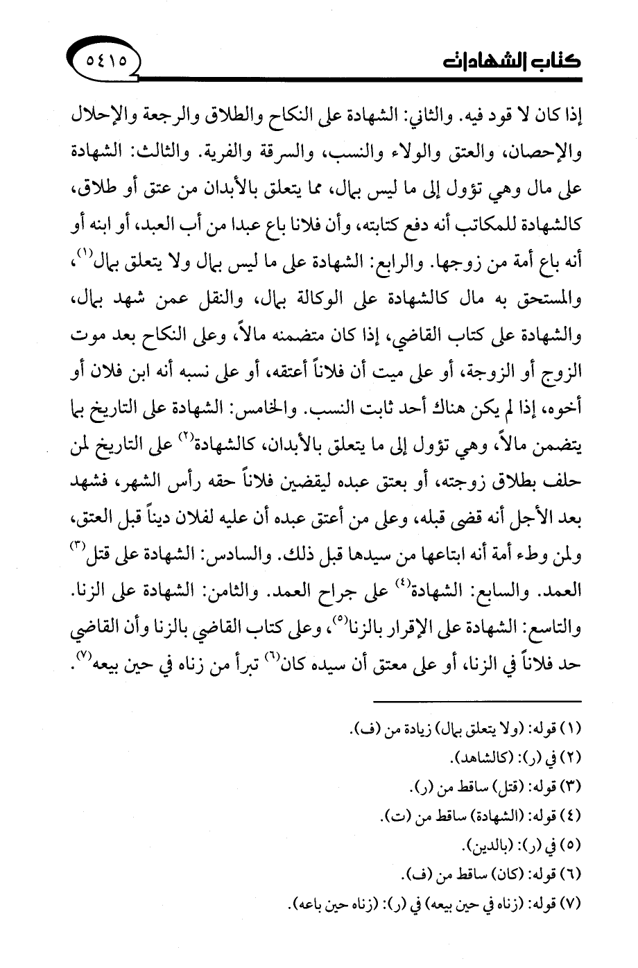 إذا كان لا قود فيه. والثاني: الشهادة على النكاح والطلاق والرجعة والإحلال والإحصان، والعتق والولاء والنسب، والسرقة والفرية. والثالث: الشهادة على مال وهي تؤول إلى ما ليس بمال، مما يتعلق بالأبدان من عتق أو طلاق، كالشهادة للمكاتب أنه دفع كتابته، وأن فلانًا باع عبدًا من أب العبد، أو ابنه أو أنه باع أمة من زوجها. والرابع: الشهادة على ما ليس بمال ولا يتعلق بمال (¬1)، والمستحق به مال كالشهادة على الوكالة بمال، والنقل عمن شهد بمال، والشهادة على كتاب القاضي، إذا كان متضمنه مالًا، وعلى النكاح بعد موت الزوج أو الزوجة، أو على ميت أن فلانًا أعتقه، أو على نسبه أنه ابن فلان أو أخوه، إذا لم يكن هناك أحد ثابت النسب. والخامس: الشهادة على التاريخ بما يتضمن مالًا، وهي تؤول إلى ما يتعلق بالأبدان، كالشهادة (¬2) على التاريخ لمن حلف بطلاق زوجته، أو بعتق عبده ليقضين فلانًا حقه رأس الشهر، فشهد بعد الأجل أنه قضى قبله، وعلى من أعتق عبده أن عليه لفلان دينًا قبل العتق، ولمن وطء أمة أنه ابتاعها من سيدها قبل ذلك. والسادس: الشهادة على قتل (¬3) العمد. والسابع: الشهادة (¬4) على جراح العمد. والثامن: الشهادة على الزنا. والتاسع: الشهادة على الإقرار بالزنا (¬5)، وعلى كتاب القاضي بالزنا وأن القاضي حد فلانًا في الزنا، أو على معتق أن سيده كان (¬6) تبرأ من زناه في حين بيعه (¬7).