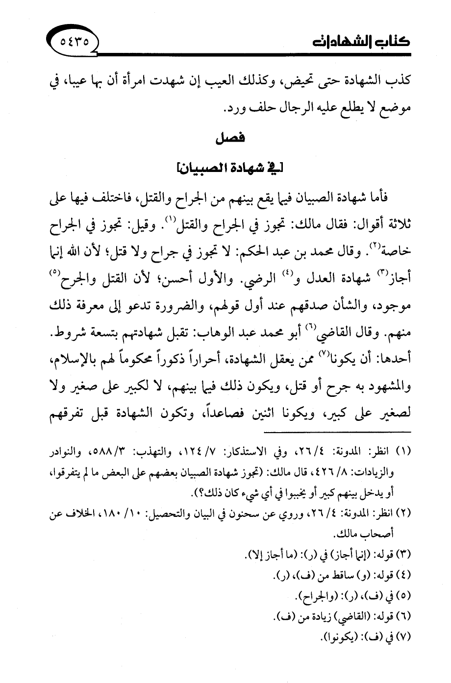 فأما شهادة الصبيان فيما يقع بينهم من الجراح والقتل، فاختلف فيها على ثلاثة أقوال: فقال مالك: تجوز في الجراح والقتل (¬1). وقيل: تجوز في الجراح خاصة (¬2). وقال محمد بن عبد الحكم: لا تجوز في جراح ولا قتل؛ لأن الله إنما أجاز (¬3) شهادة العدل و (¬4) الرضي. والأول أحسن؛ لأن القتل والجرح (¬5) موجود، والشأن صدقهم عند أول قولهم، والضرورة تدعو إلى معرفة ذلك منهم. وقال القاضي (¬6) أبو محمد عبد الوهاب: تقبل شهادتهم بتسعة شروط. أحدها: أن يكونا (¬7) ممن يعقل الشهادة، أحرارًا ذكورًا محكومًا لهم بالإسلام، والمشهود به جرح أو قتل، ويكون ذلك فيما بينهم، لا لكبير على صغير ولا لصغير على كبير، ويكونا ائنين فصاعدًا، وتكون الشهادة قبل تفرقهم