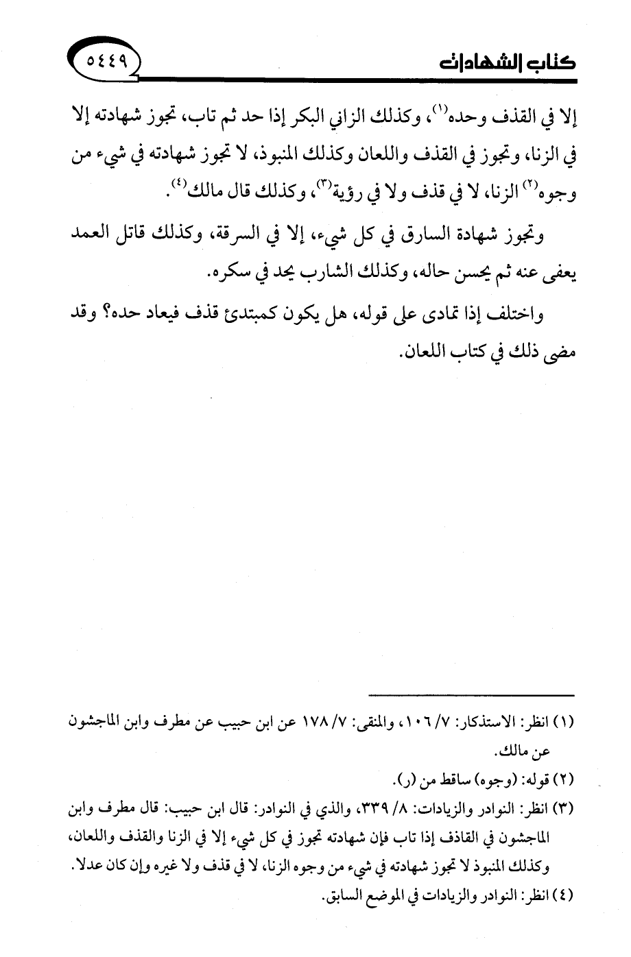 (¬3) انظر: النوادر والزيادات: 8/ 339، والذي في النوادر: قال ابن حبيب: قال مطرف وابن الماجشون في القاذف إذا تاب فإن شهادته تجوز في كل شيء إلا في الزنا والقذف واللعان، وكذلك المنبوذ لا تجوز شهادته في شيء من وجوه الزنا، لا في قذف ولا غيره وإن كان عدلًا.
