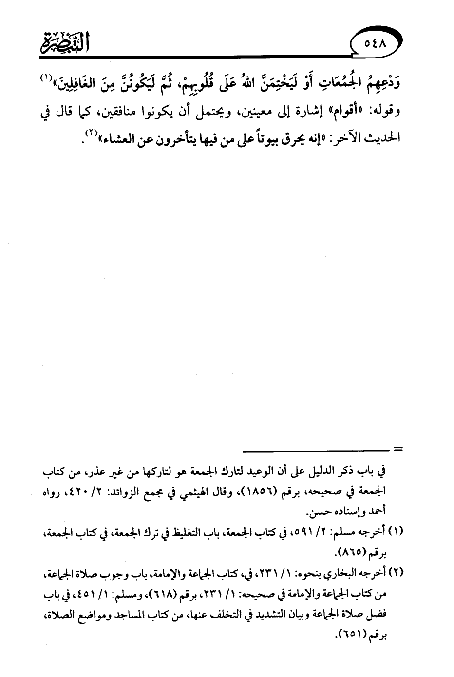 (¬2) أخرجه البخاري بنحوه: 1/ 231، في, كتاب الجماعة والإمامة, باب وجوب صلاة الجماعة، من كتاب الجماعة والإمامة في صحيحه: 1/ 231، برقم (618)، ومسلم: 1/ 451، في باب فضل صلاة الجماعة وبيان التشديد في التخلف عنها، من كتاب المساجد ومواضع الصلاة، برقم (651).