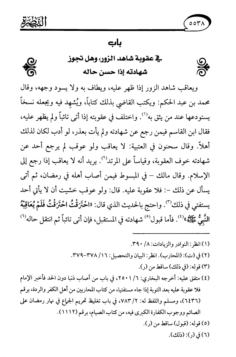 ويعاقب شاهد الزور إذا ظهر عليه، ويطاف به ولا يسود وجهه، وقال محمد بن عبد الحكم: ويكتب القاضي بذلك كتابًا، ويُشهِد فيه ويجعله نسخًا يستودعها عند من يثق به (¬1). واختلف في عقوبته إذا أتى تائبًا ولم يظهر عليه، فقال ابن القاسم فيمن رجع عن شهادته ولم يأت بعذر، لو أدب لكان لذلك أهلًا. وقال سحنون في العتبية: لا يعاقب ولو عوقب لم يرجع أحد عن شهادته خوف العقوبة، وقياسًا على المرتد (¬2). يريد أنه لا يعاقب إذا رجع إلى الإسلام. وقال مالك -في المبسوط فيمن أصاب أهله في رمضان، ثم أتى يسأل عن ذلك-: فلا عقوبة عليه. قال: ولو عوقب خشيت أن لا يأتي أحد يستفتي في ذلك (¬3). واحتج بالحديث الذي قال: "احْتَرَقْتُ احْتَرَقْتُ فَلَمْ يُعَاقِبْهُ النَّبِيُّ - صلى الله عليه وسلم -" (¬4). فأما قبول (¬5) شهادته في المستقبل، فإن أتى تائبًا ثم انتقل حاله (¬6)