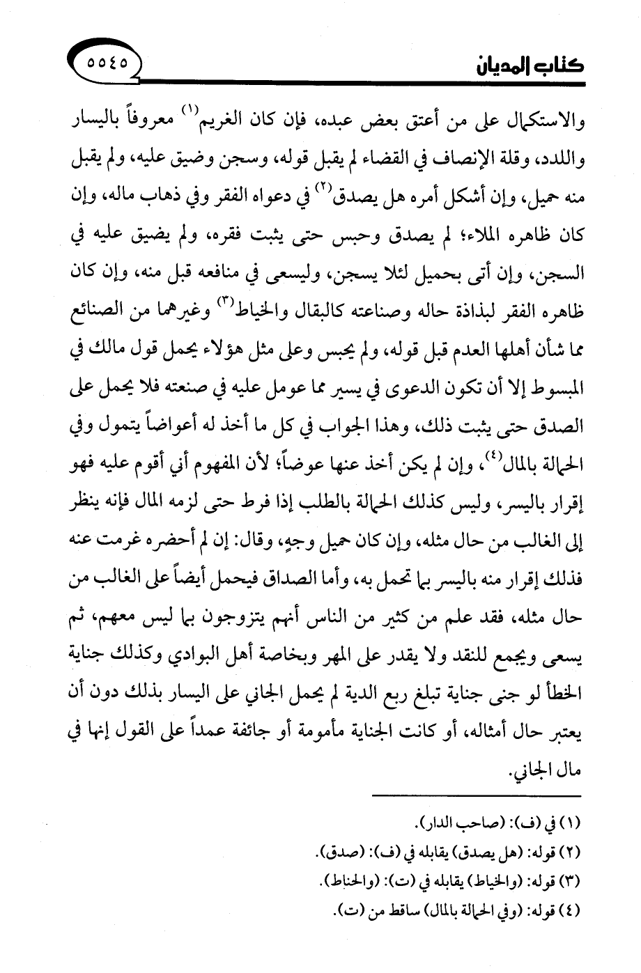 والاستكمال على من أعتق بعض عبده، فإن كان الغريم (¬1) معروفًا باليسار واللدد، وقلة الإنصاف في القضاء لم يقبل قوله، وسجن وضيق عليه، ولم يقبل منه حميل، وإن أشكل أمره هل يصدق (¬2) في دعواه الفقر وفي ذهاب ماله، وإن كان ظاهره الملاء، لم يصدق وحبس حتى يثبت فقره، ولم يضيق عليه في السجن، وإن أتى بحميل لئلا يسجن، وليسعى في منافعه قبل منه، وإن كان ظاهره الفقر لبذاذة حاله وصناعته كالبقال والخياط (¬3) وغيرهما من الصنائع مما شأن أهلها العدم قبل قوله، ولم يحبس وعلى مثل هؤلاء يحمل قول مالك في المبسوط إلا أن تكون الدعوى في يسير مما عومل عليه في صنعته فلا يحمل على الصدق حتى يثبت ذلك، وهذا الجواب في كل ما أخذ له أعواضًا يتمول وفي الحمالة بالمال (¬4)، وإن لم يكن أخذ عنها عوضًا؛ لأن المفهوم أني أقوم عليه فهو إقرار باليسر، وليس كذلك الحمالة بالطلب إذا فرط حتى لزمه المال فإنه ينظر إلى الغالب من حال مثله، وإن كان حميل وجهٍ, وقال: إن لم أحضره غرمت عنه فذلك إقرار منه باليسر بما تحمل به، وأما الصداق فيحمل أيضًا على الغالب من حال مثله، فقد علم من كثير من الناس أنهم يتزوجون بما ليس معهم، ثم يسعى ويجمع للنقد ولا يقدر على المهر وبخاصة أهل البوادي وكذلك جناية الخطأ لو جنى جناية تبلغ ربع الدية لم يحمل الجاني على اليسار بذلك دون أن يعتبر حال أمثاله، أو كانت الجناية مأمومة أو جائفة عمدًا على القول إنها في مال الجاني.
