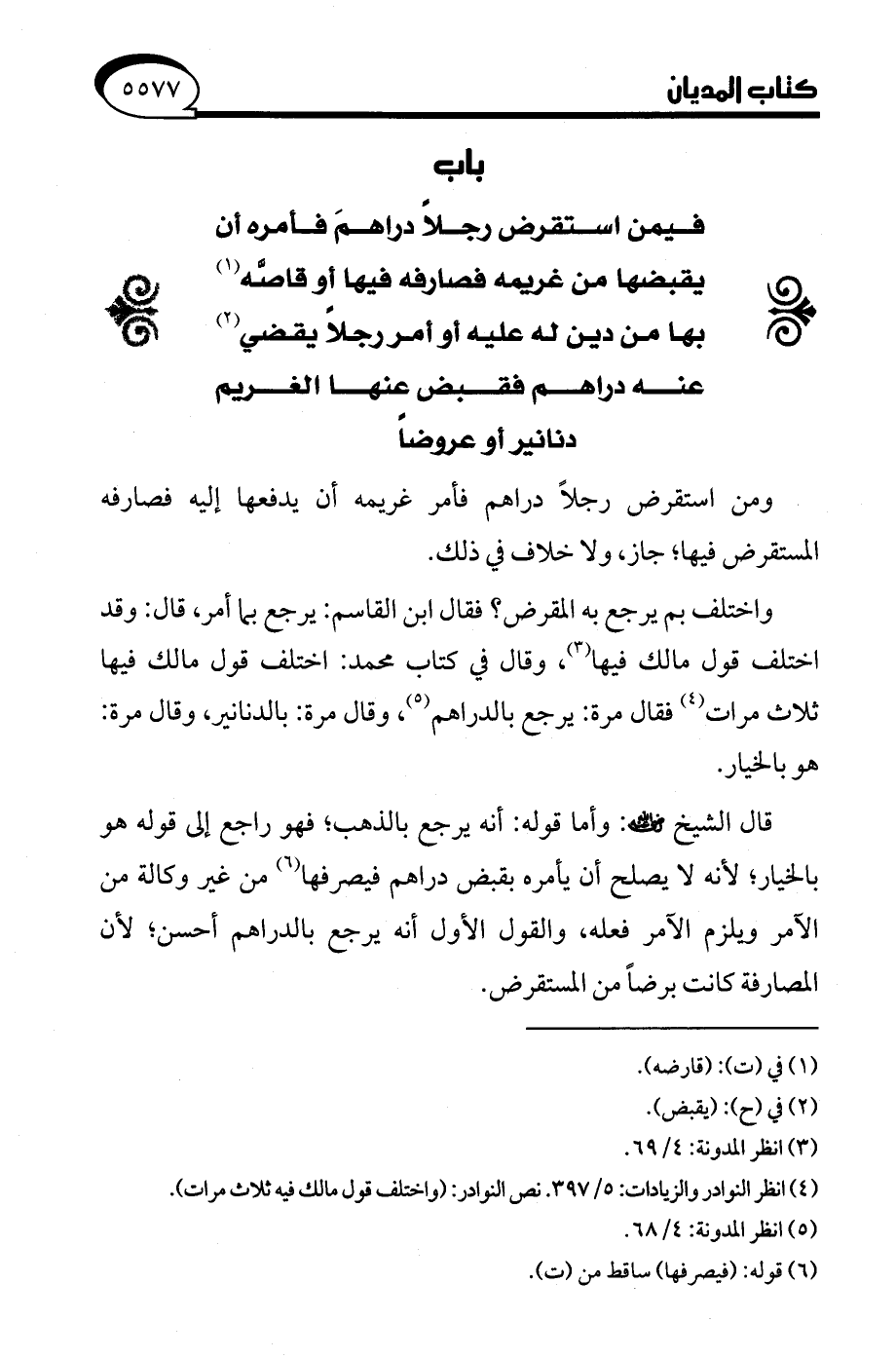قال الشيخ - رضي الله عنه -: وأما قوله: أنه يرجع بالذهب، فهو راجع إلى قوله هو بالخيار؛ لأنه لا يصلح أن يأمره بقبض دراهم فيصرفها (¬6) من غير وكالة من الآمر ويلزم الآمر فعله، والقول الأول أنه يرجع بالدراهم أحسن؛ لأن المصارفة كانت برضًا من المستقرض.