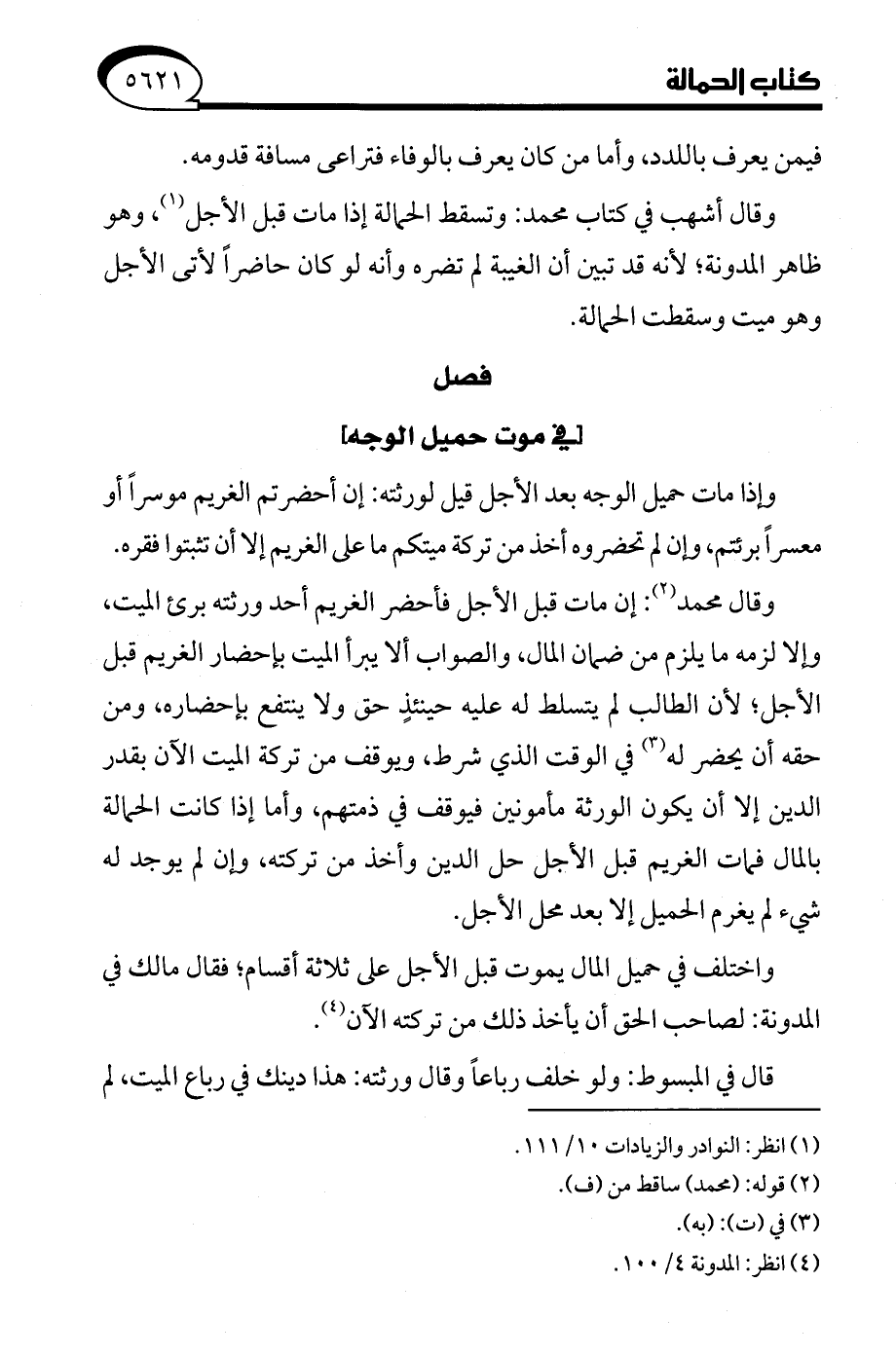 واختلف في حميل المال يموت قبل الأجل على ثلاثة أقسام، فقال مالك في المدونة: لصاحب الحق أن يأخذ ذلك من تركته الآن (¬4).