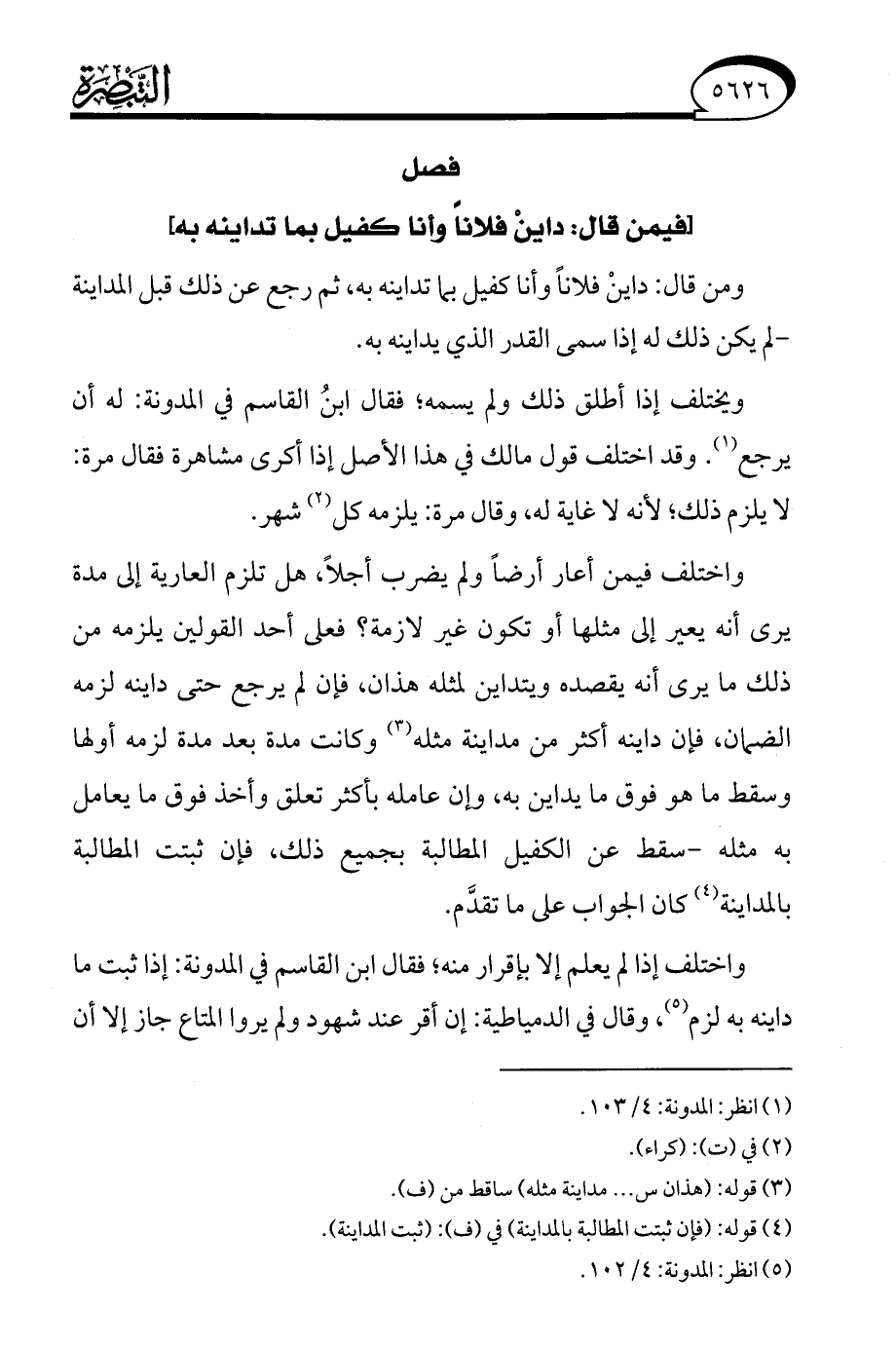 واختلف فيمن أعار أرضًا ولم يضرب أجلًا، هل تلزم العارية إلى مدة يرى أنه يعير إلى مثلها أو تكون غيى لازمة؟ فعلى أحد القولين يلزمه من ذلك ما يرى أنه يقصده ويتداين لمثله هذان، فإن لم يرجع حتى داينه لزمه الضمان، فإن داينه أكثر من مداينة مثله (¬3) وكانت مدة بعد مدة لزمه أولها وسقط ما هو فوق ما يداين به، وإن عامله بأكثر تعلق وأخذ فوق ما يعامل به مثله- سقط عن الكفيل المطالبة بجميع ذلك، فإن ثبتت المطالبة بالمداينة (¬4) كان الجواب على ما تقدَّم.