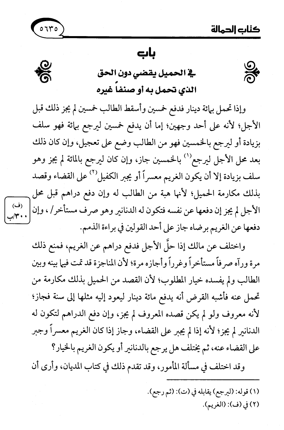 وإذا تحمل بمائة دينار فدفع خمسين وأسقط الطالب خمسين لم يجز ذلك قبل الأجل؛ لأنه على أحد وجهين، إما أن يدفع خمسين ليرجع بمائة فهو سلف بزيادة أو ليرجع بالخمسين فهو من الطالب وضع على تعجيل، وإن كان ذلك بعد محل الأجل ليرجع (¬1) بالخمسن جاز، وإن كان ليرجع بالمائة لم يجز وهو سلف بزيادة إلا أن يكون الغريم معسرًا أو يجبر الكفيل (¬2) على القضاء وقصد بذلك مكارمة الحميل؛ لأنها هبة من الطالب له وإن دفع دراهم قبل محل الأجل لم يجز إن دفعها عن نفسه فتكون له الدنانير وهو صرف مستأخر، وإن دفعها عن الغريم برضاه جاز على أحد القولين في براءة الذمم.