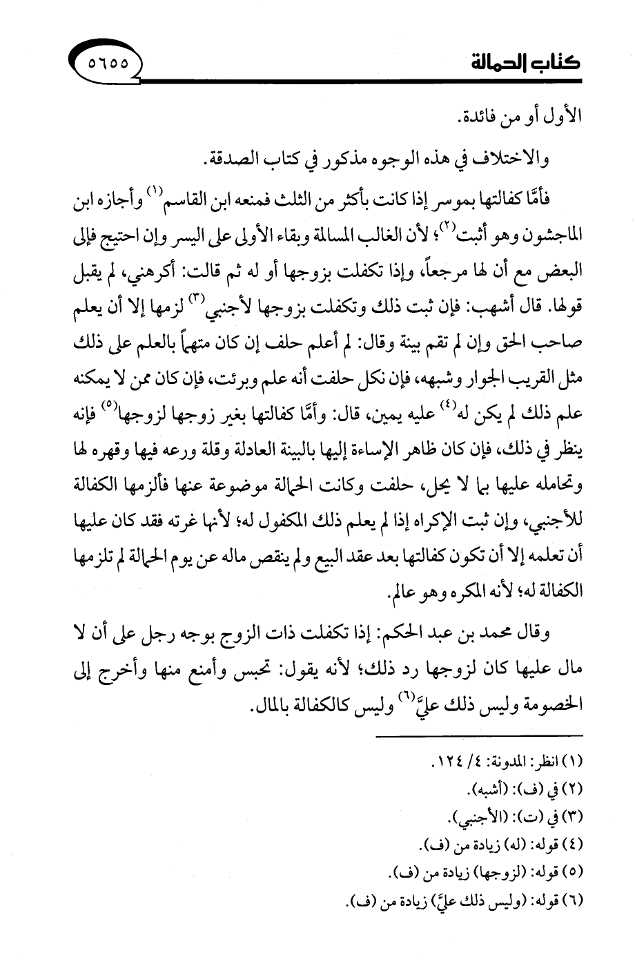 وقال محمد بن عبد الحكم: إذا تكفلت ذات الزوج بوجه رجل على أن لا مال عليها كان لزوجها رد ذلك؛ لأنه يقول: تحبس وأمنع منها وأخرج إلى الخصومة وليس ذلك عليَّ (¬6) وليس كالكفالة بالمال.