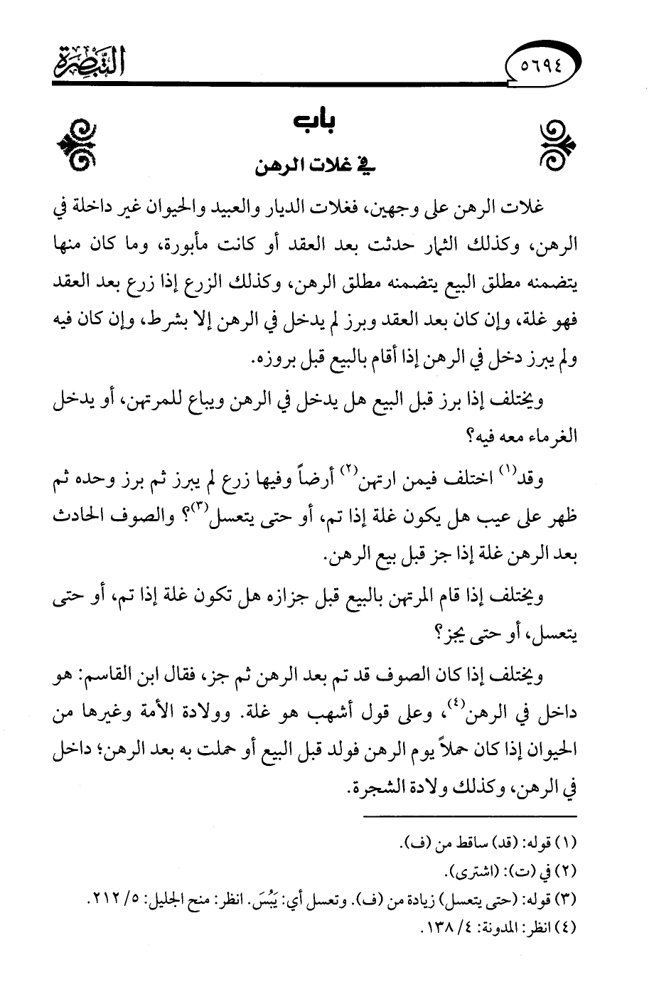 ويختلف إذا كان الصوف قد تم بعد الرهن ثم جز، فقال ابن القاسم: هو داخل في الرهن (¬4)، وعلى قول أشهب هو غلة. وولادة الأمة وغيرها من الحيوان إذا كان حملًا يوم الرهن فولد قبل البيع أو حملت به بعد الرهن، داخل في الرهن، وكذلك ولادة الشجرة.