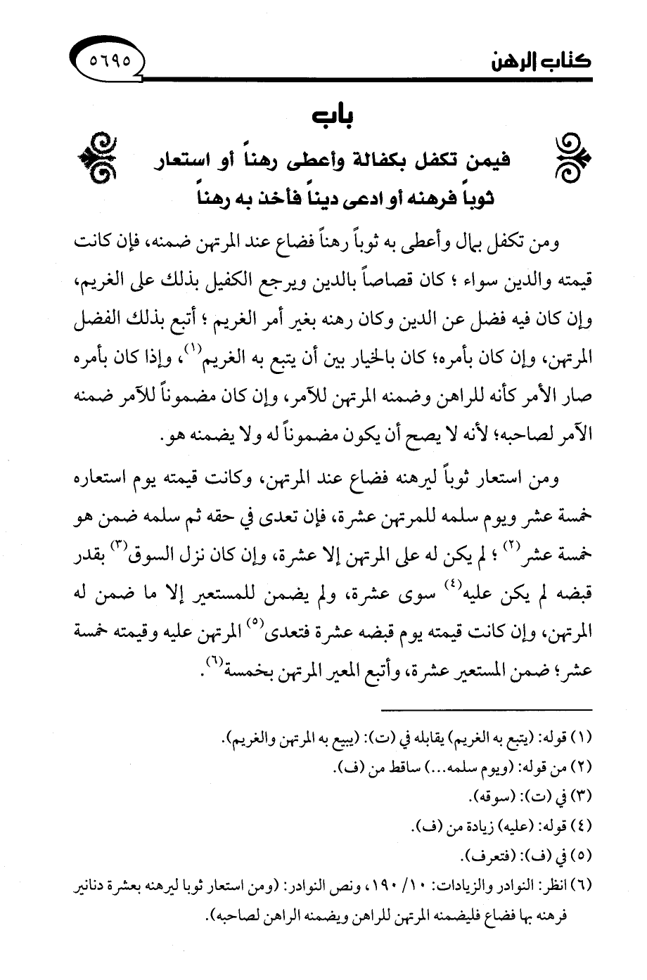 (¬6) انظر: النوادر والزيادات: 10/ 190، ونص النوادر: (ومن استعار ثوبا ليرهنه بعشرة دنانير فرهنه بها فضاع فليضمنه المرتهن للراهن ويضمنه الراهن لصاحبه).