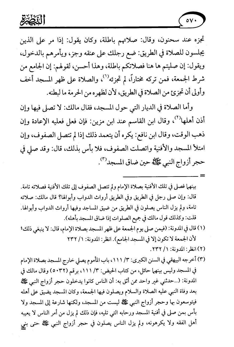 = بينهما فصلى في تلك الأفنية بصلاة الإِمام ولم تتصل الصفوف إلى تلك الأفنية فصلاته تامة. قال: وإن صلى رجل في الطريق وفي الطريق أرواث الدواب وأبوالها؟ قال مالك: صلاته تامة، ولم يزل الناس يصلون في الطريق من ضيق المساجد وفيها أرواث الدواب وأبوالها. قلت: وكذلك قول مالك في جميع الصلوات إذا ضاق المسجد بأهله).