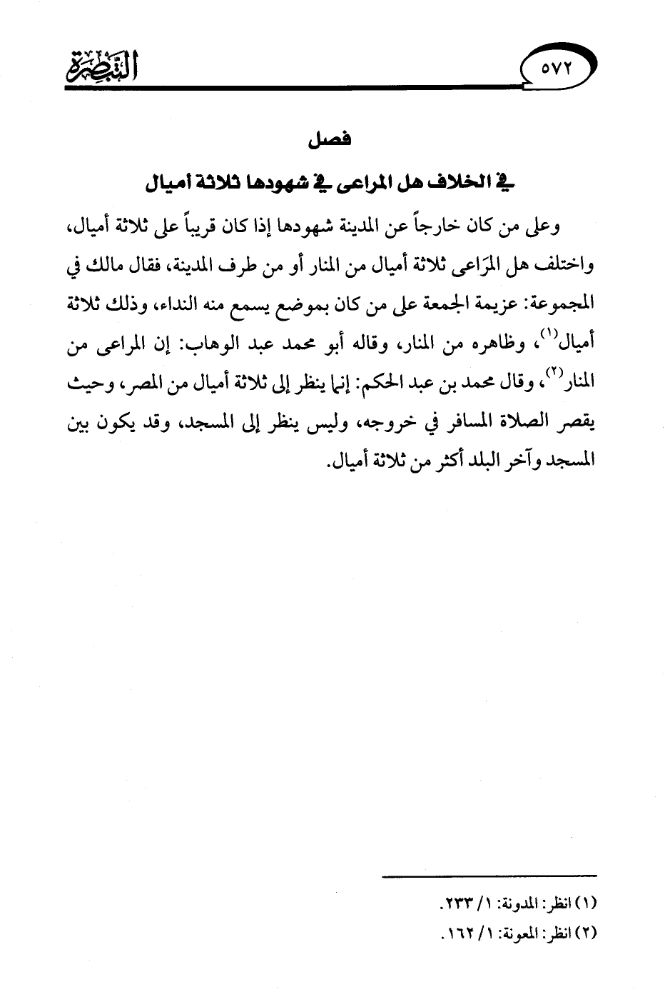 وعلى من كان خارجًا عن المدينة شهودها إذا كان قريبًا على ثلاثة أميال، واختلف هل المرَاعى ثلاثة أميال من المنار أو من طرف المدينة، فقال مالك في المجموعة: عزيمة الجمعة على من كان بموضع يسمع منه النداء، وذلك ثلاثة أميال (¬1)، وظاهره من المنار، وقاله أبو محمَّد عبد الوهاب: إن المراعى من المنار (¬2)، وقال محمَّد بن عبد الحكم: إنما ينظر إلى ثلاثة أميال من العصر، وحيث يقصر الصلاة المسافر في خروجه, وليس ينظر إلى المسجد، وقد يكون بين المسجد وآخر البلد أكثر من ثلاثة أميال.