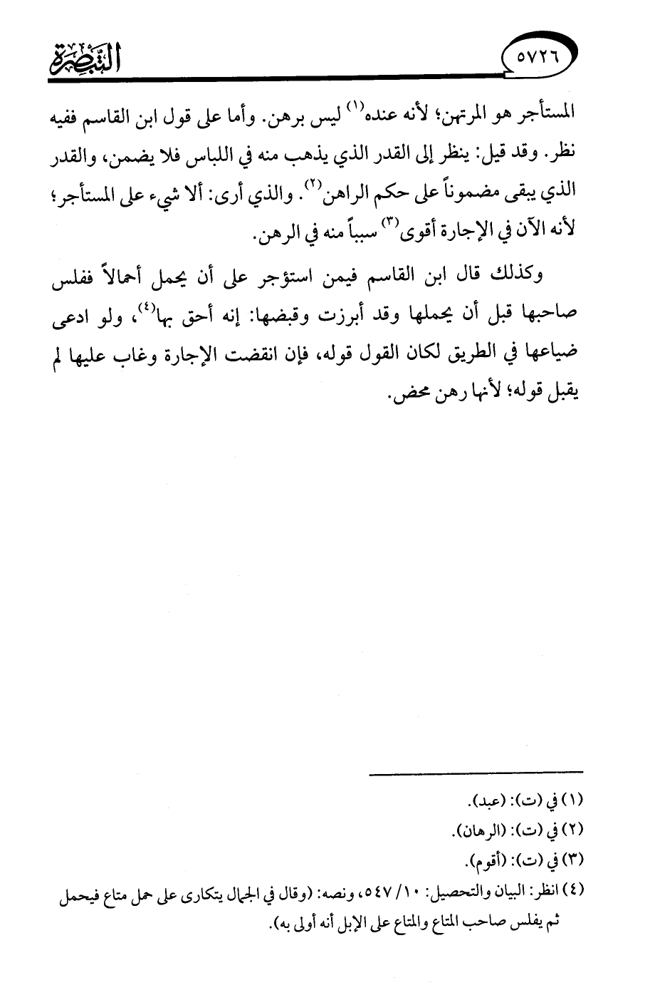 (¬4) انظر: البيان والتحصيل: 10/ 547، ونصه: (وقال في الجمال يتكارى على حمل متاع فيحمل ثم يفلس صاحب المتاع والمتاع على الإبل أنه أولى به).