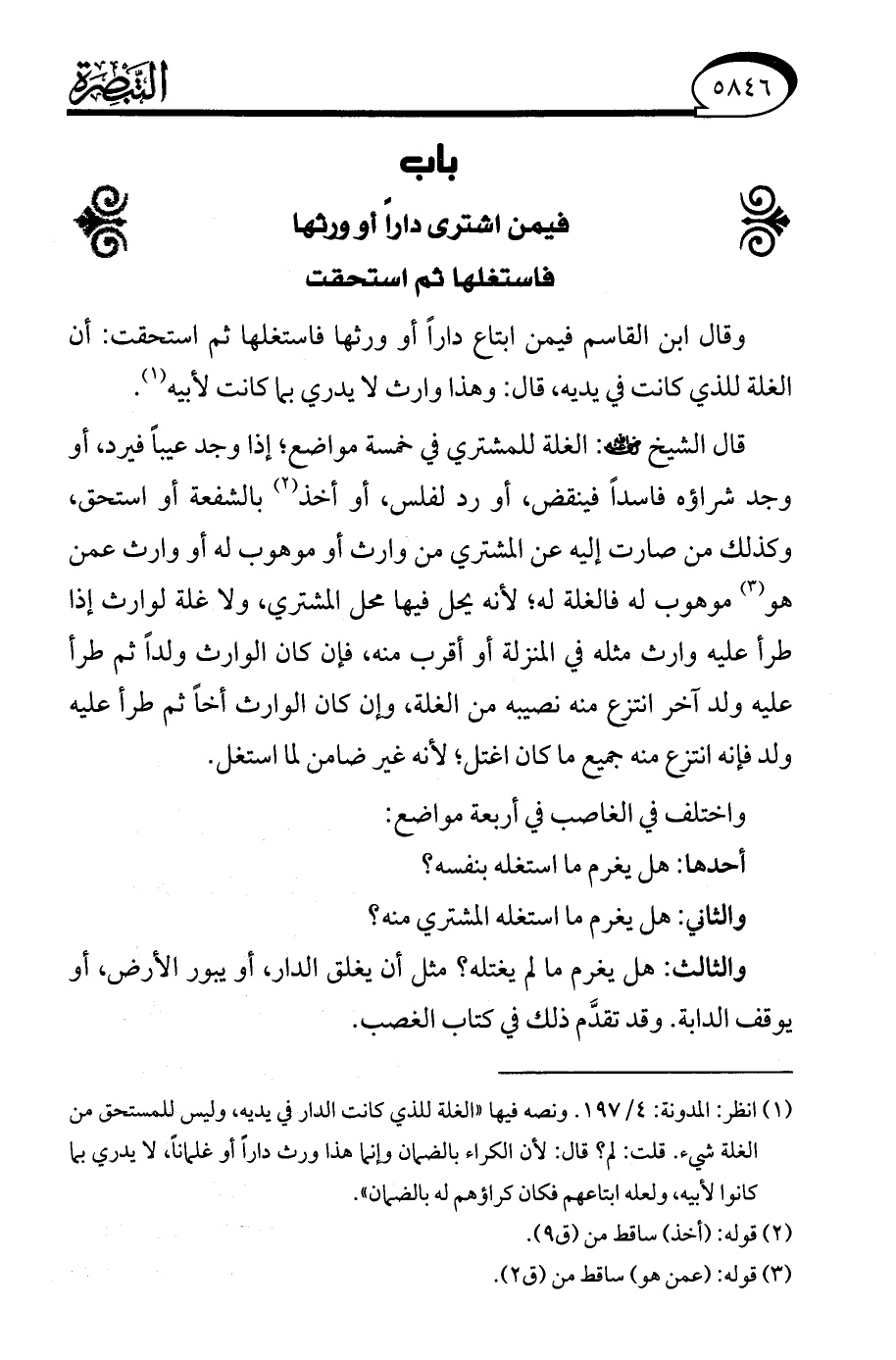 قال الشيخ - رضي الله عنه -: الغلة للمشتري في خمسة مواضع، إذا وجد عيبًا فيرد، أو وجد شراؤه فاسدًا فينقض، أو رد لفلس، أو أخذ (¬2) بالشفعة أو استحق، وكذلك من صارت إليه عن المشتري من وارث أو موهوب له أو وارث عمن هو (¬3) موهوب له فالغلة له؛ لأنه يحل فيها محل المشتري، ولا غلة لوارث إذا طرأ عليه وارث مثله في المنزلة أو أقرب منه، فإن كان الوارث ولدًا ثم طرأ عليه ولد آخر انتزع منه نصيبه من الغلة، وإن كان الوارث أخًا ثم طرأ عليه ولد فإنه انتزع منه جميع ما كان اغتل؛ لأنه غير ضامن لما استغل.