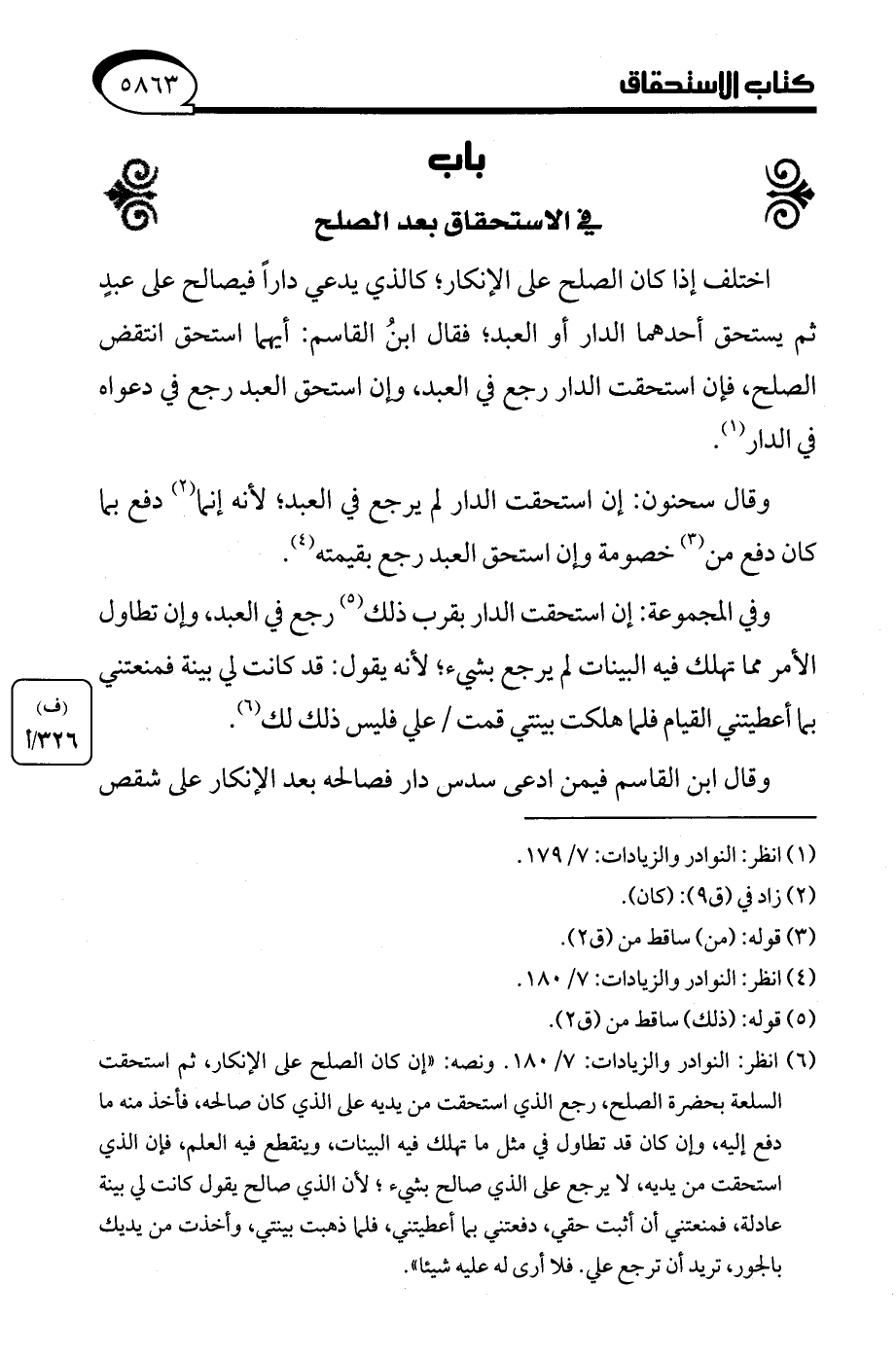 (¬6) انظر: النوادر والزيادات: 7/ 180. ونصه: "إن كان الصلح على الإنكار، ثم استحقت السلعة بحضرة الصلح، رجع الذي استحقت من يديه على الذي كان صالحه، فأخذ منه ما دفع إليه، وإن كان قد تطاول في مثل ما تهلك فيه البينات، وينقطع فيه العلم، فإن الذي استحقت من يديه، لا يرجع على الذي صالح بشيء؛ لأن الذي صالح يقول كانت لي بينة عادلة، فمنعتني أن أثبت حقي، دفعتني بما أعطيتني، فلما ذهبت بينتي، وأخذت من يديك بالجور، تريد أن ترجع علي. فلا أرى له عليه شيئا".