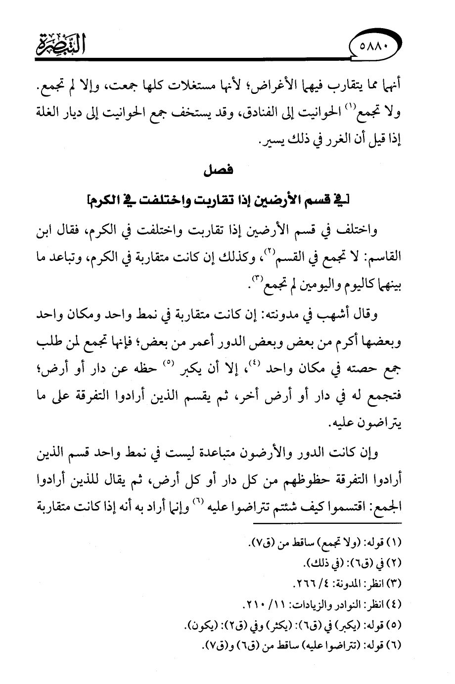واختلف في قسم الأرضين إذا تقاربت واختلفت في الكرم، فقال ابن القاسم: لا تجمع في القسم (¬2)، وكذلك إن كانت متقاربة في الكرم، وتباعد ما بينهما كاليوم واليومين لم تجمع (¬3).