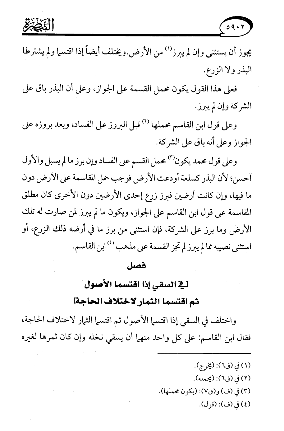 واختلف في السقي إذا اقتسما الأصول ثم اقتسما الثمار لاختلاف الحاجة، فقال ابن القاسم: على كل واحد منهما أن يسقي نخله وإن كان ثمرها لغيره