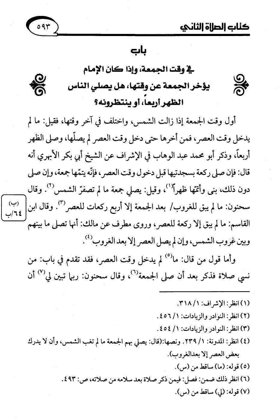 (¬4) انظر: المدونة: 1/ 239. ونصها: (قال: يصلي بهم الجمعة ما لم تغلب الشمس، وأن لا يدرك بعض العصر إلا بعد الغروب).